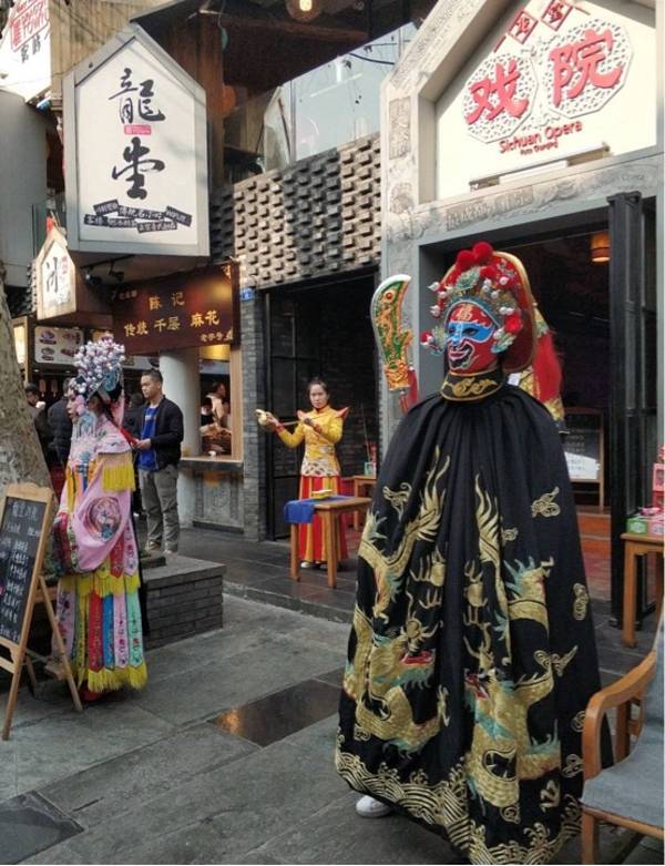 宽窄巷子由三条水平主干道组成——宽巷子、窄巷子、井巷子,通过四合院周边的垂直道路将三条水平主干道连接起来,因此,这个景区没有严格的大门,也不需要门票,从任何方向都能够进入景区,只是进入景区的路口有一些特殊的雕塑、广场、小品等来明确宽窄巷子的出入口。景区内主要以四川特色饮食为主要经营项目,三大炮、老妈兔头、板鸭、伤心凉粉、甜水面、冰粉等应有尽有,可以随意挑选;还有各式川菜馆也经过四合院的特色打造,而升级为品牌特色馆,同时具备休闲、聊天、吃饭的场所,听说成都好些白领常常到这样的特色馆度过晚上或周末;景区特卖的巷子酸奶(各个景区都有以景区为名的酸奶销售),应该是旅游爱好者的最爱吧。景区内还有掏耳朵的特色服务,30元一次哈;真人假扮铜人与游客拍照,20元一次哈;还有其它景区都有的刺绣布艺、手工木制、蜀绣等手工艺零售摊点。给我印象最深的,当属流浪歌手在街头弹唱,人漂亮、穿着朴实,歌曲与当时逛街的心情很贴合,所以,在那里停留了很久。宽窄巷子上的川剧表演馆很多,多是表演一两个曲目,门口常有一位花脸在招揽生意,建议晚上去琴台路仿古街的蜀风雅韵看川剧。当然,景区也有传统(其它景区都有)的小生意,如棉花糖、玫瑰茶叶、转糖轮等;见山书局售卖特色书籍,旅人邮局可购买特色明信片邮寄到自己的家中;西餐厅、咖啡厅等西式餐饮也设置其中。