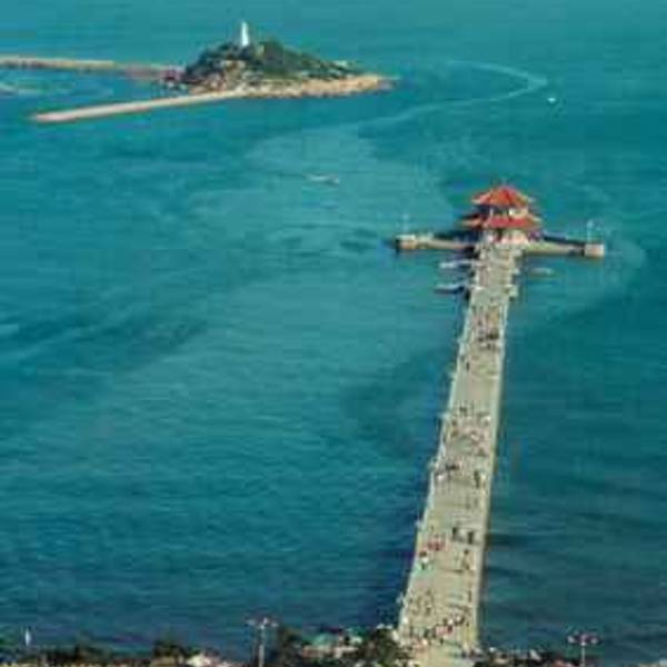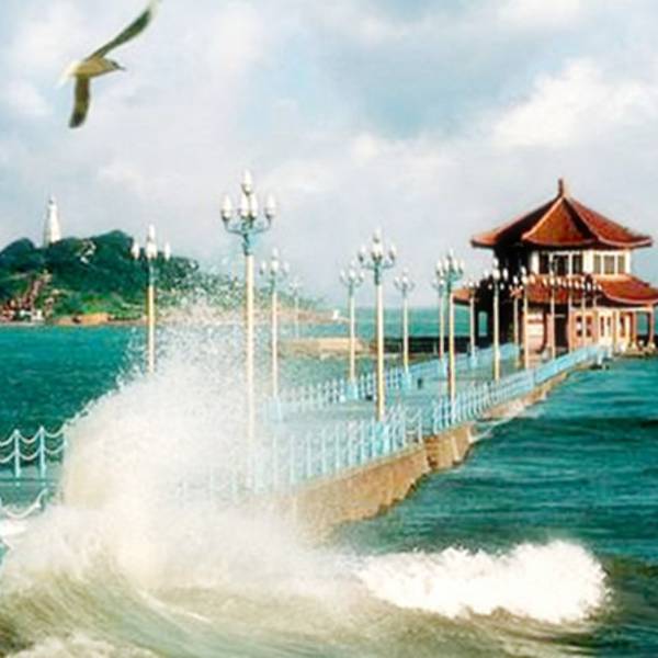 栈桥位于青岛中心城区的南部海滨,是一条440米长的海上长廊,从陆地延伸入海中。栈桥建于清光绪年间(1892年),已有百年历史,一直以来被视为青岛的象征。栈桥尽头的回澜阁,则是青岛近代历史的见证。 栈桥曾是青岛的军事专用人工码头。栈桥与小青岛景区隔水相望,北端与中山路商业街成一直线相连,栈桥的尽头建有三角形防波堤,而这里有一座具有民族风格的八角亭阁回澜阁。回澜阁里面有一块无字碑,这块石碑的来历至今众说纷纭。现在,阁内通过主题展陈的方式,全面展示青岛近现代历史、人文、民俗等独特城市风貌。 栈桥两边有铁链护栏和莲花路灯,游人漫步于栈桥海滨,风平浪静时,可观看海鸥在此自由翱翔。走到桥的尽头还可远眺小青岛景区。岛上树影婆娑、绿荫成群,一座白灯塔亭亭玉立。涨潮时,惊涛拍打着防波堤,激起簇簇浪花,可驻足观看。退潮时,赭色岩礁和金色沙滩露出水面,可走下栈桥,漫步在海滩上赶海拾贝。 青岛火车站就在不远处,步行至栈桥也就10分钟路程,当你下火车走出站厅便能看到伸入海中的栈桥。栈桥的北端两侧是栈桥公园。东侧红瓦绿树交相辉映,各式建筑参差错落地分布在海滨边。而栈桥的西侧,是第六海滨浴场,盛夏季节这里常常云集了很多当地游泳者。