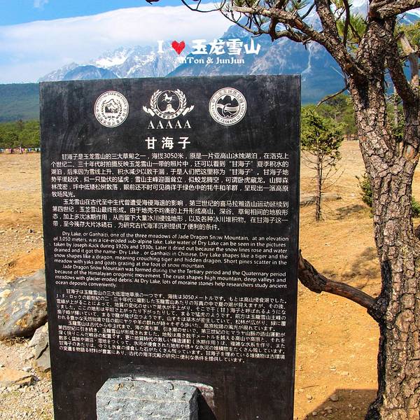 实用 在大马路旁的甘海子景点出现在偌大宽敞的空地上,显得如此安静,很久以前这里是一片海、后来干枯掉了...从蓝月谷出发往城区走,在大马路旁的甘海子景点出现在偌大宽敞的空地上,显得如此安静,很久以前这里是一片海、后来干枯掉了就叫甘海子了,在这里同样可以看到俊美巍峨的玉龙雪山,观景角度较佳。导游让我们下车...从蓝月谷出发往城区走,在大马路旁的甘海子景点出现在偌大宽敞的空地上,显得如此安静,很久以前这里是一片海、后来干枯掉了就叫甘海子了,在这里同样可以看到俊美巍峨的玉龙雪山,观景角度较佳。导游让我们下车拍了几张照片,此时旁边没有其他的游人,这块地暂时是属于我们的!空旷的草地上现在种满了树,偶尔会有车子通过。