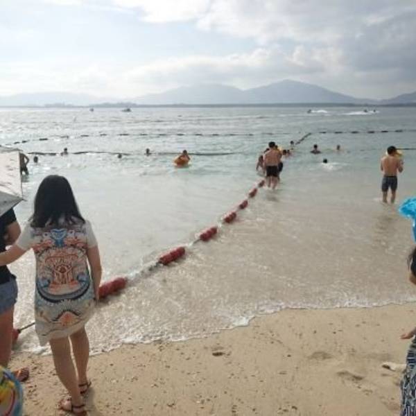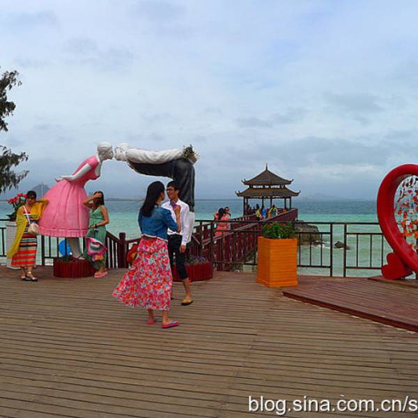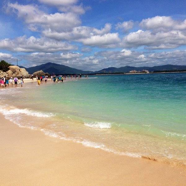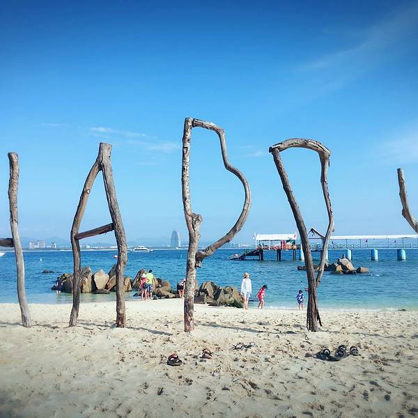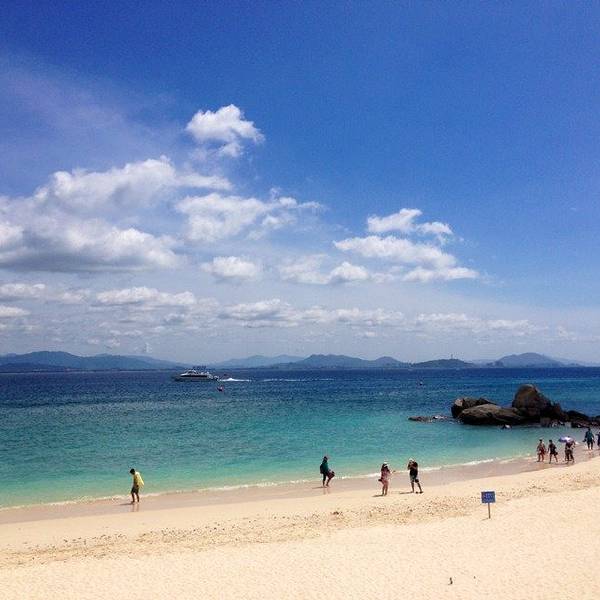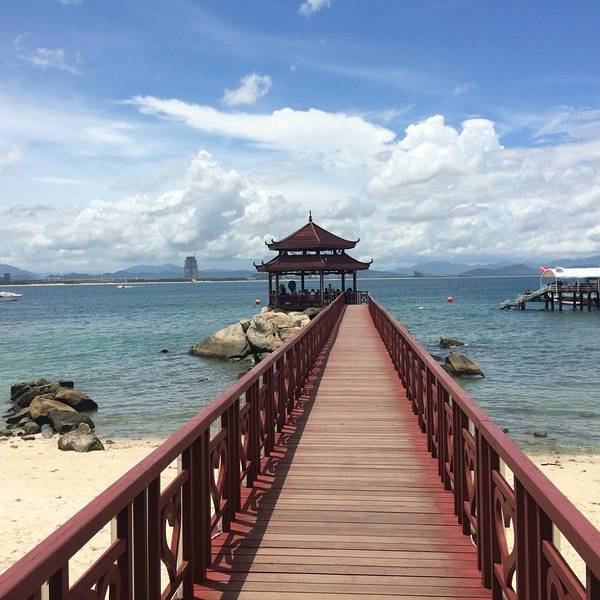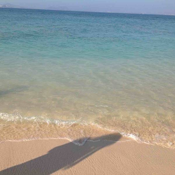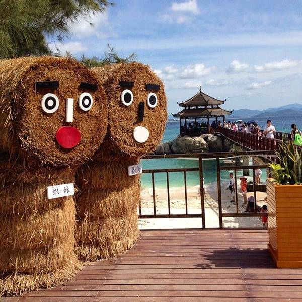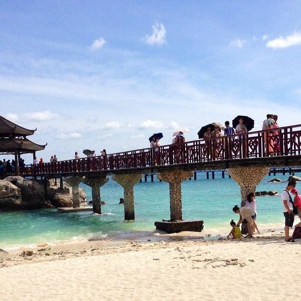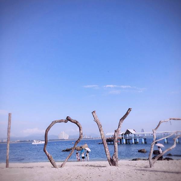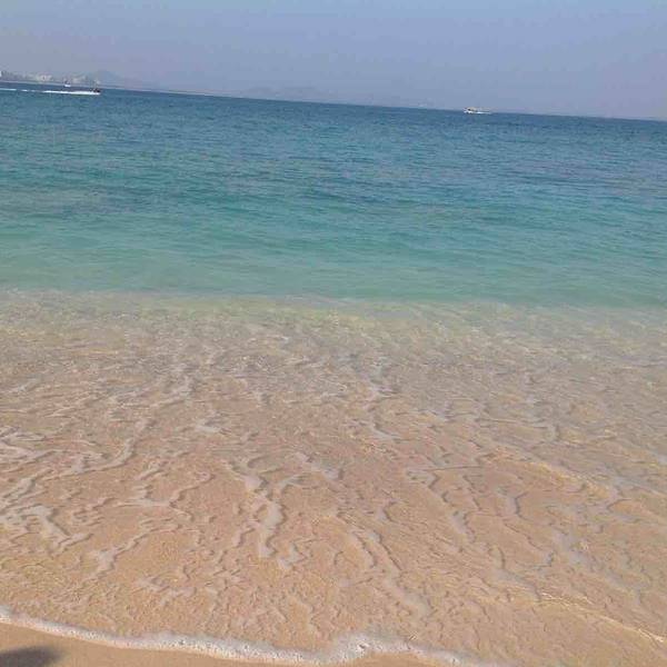 中午办理退房手续后,可以在酒店免费寄存行李,下午继续玩。这时阳光正好,登岛的游客也很多了,十分热闹。海水颜色层次变丰富了,手机随手一拍就是明信片(下面的美图都是手机拍的哦,原片)。美中不足就是太晒,坐在情人桥的亭子里吹海风,吃零食补充体力,就不想走了。岛上水上活动丰富,就是比其他景点贵。下图的地面冲浪,10分钟150元,玩的人很刺激很清凉,看的人很酸爽。我们在岛上并没有玩水上项目。听同一辆电瓶车上的东北大姐说,买了最贵的潜水,也没潜下去看到啥,挺浪费的。潜水还真是因个人条件而异吧。我在其他地方潜过水,潜不下去,就浮潜还行,所以就不在岛上花这冤枉钱了。