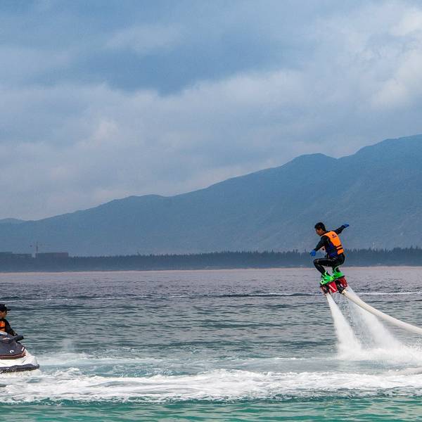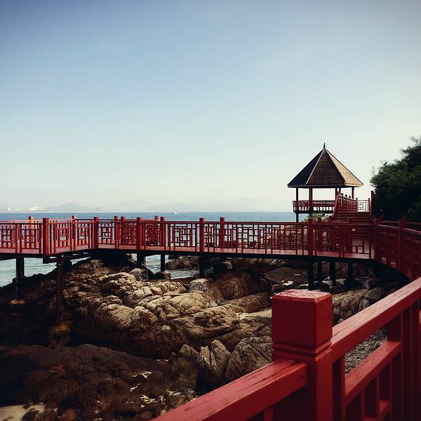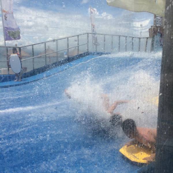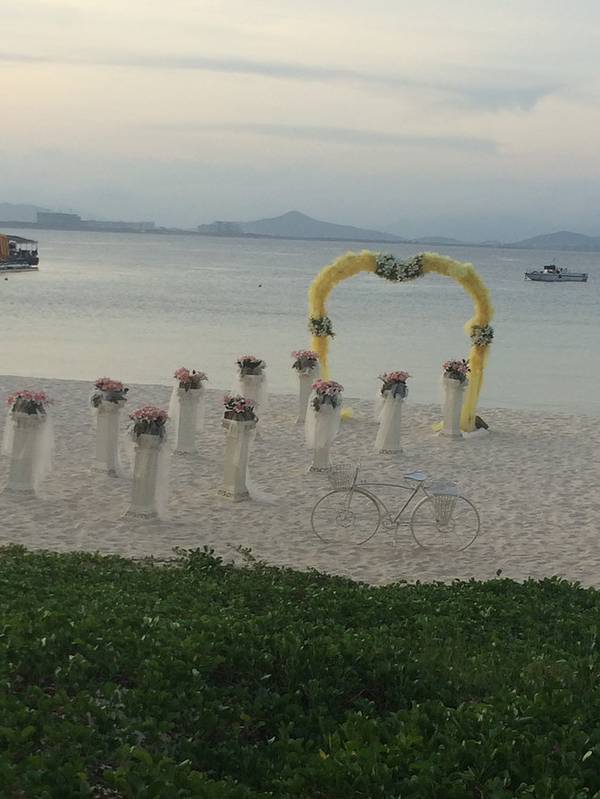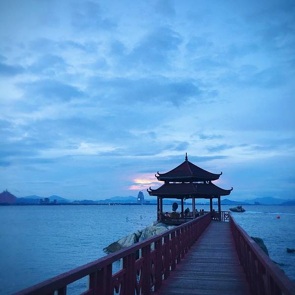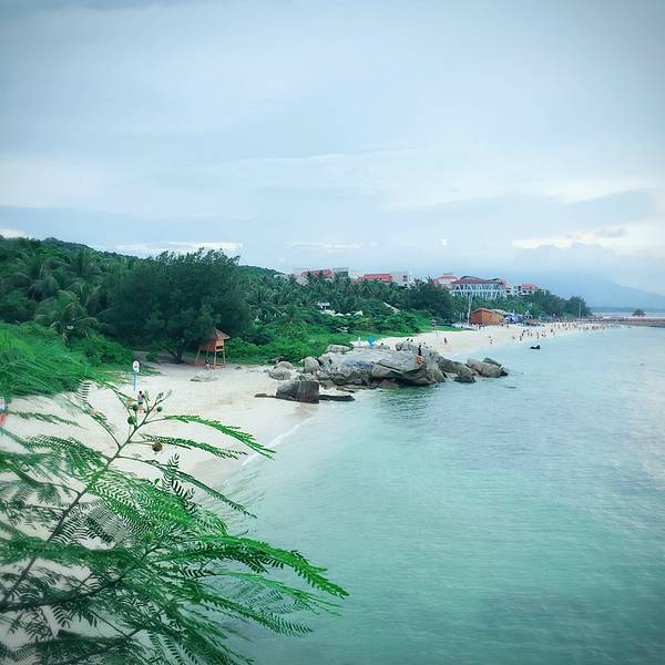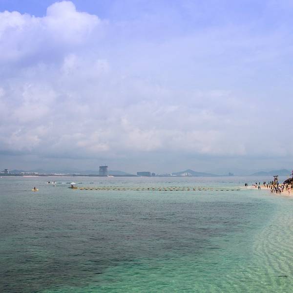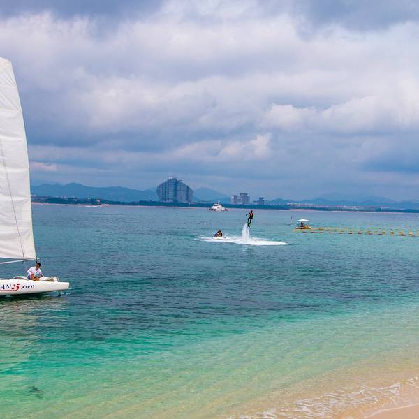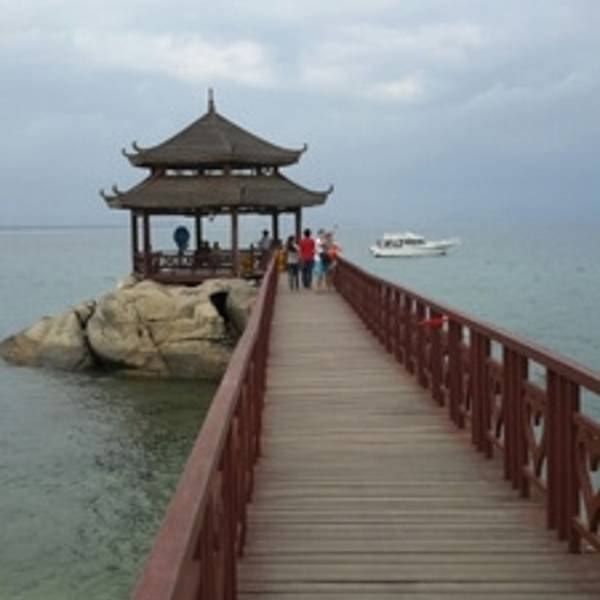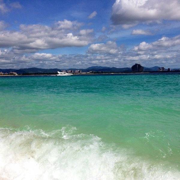 中午办理退房手续后,可以在酒店免费寄存行李,下午继续玩。这时阳光正好,登岛的游客也很多了,十分热闹。海水颜色层次变丰富了,手机随手一拍就是明信片(下面的美图都是手机拍的哦,原片)。美中不足就是太晒,坐在情人桥的亭子里吹海风,吃零食补充体力,就不想走了。岛上水上活动丰富,就是比其他景点贵。下图的地面冲浪,10分钟150元,玩的人很刺激很清凉,看的人很酸爽。我们在岛上并没有玩水上项目。听同一辆电瓶车上的东北大姐说,买了最贵的潜水,也没潜下去看到啥,挺浪费的。潜水还真是因个人条件而异吧。我在其他地方潜过水,潜不下去,就浮潜还行,所以就不在岛上花这冤枉钱了。