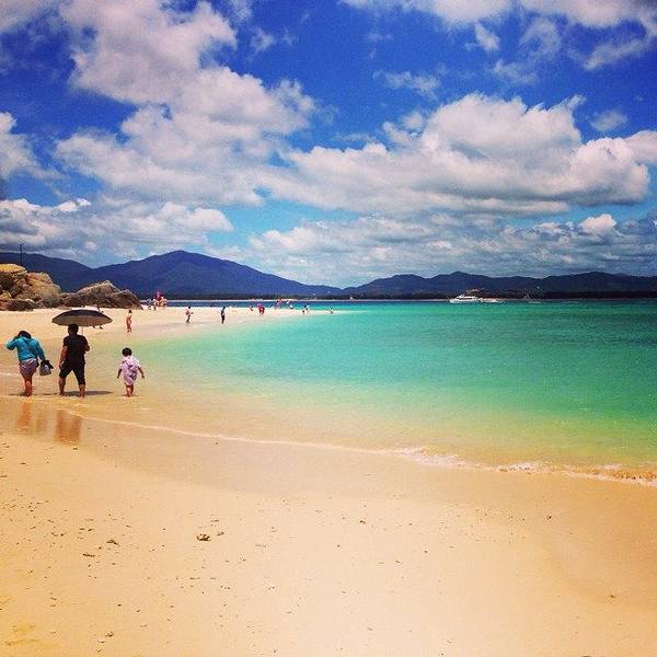 码头有许多不同名字的邮轮,如牛奇洲号、海棠之星号等等,游客坐在这些邮轮上,踏着白色的浪花,一批批登上蜈支洲岛,搭乘渡轮去蜈支洲岛。在那边有多班游轮往复于陆地及岛上之间,差不多20分钟一班,很便利。船在水面上飞行有些波动,船体跟着波浪崎岖摇晃,20分钟后,就可以看到明澈的海水啊。你或许知道夏威夷岛上特有的打招呼方式“Aloha”,但一定不能错过蜈支洲岛上更有爱的一句“Wa ai lu”!