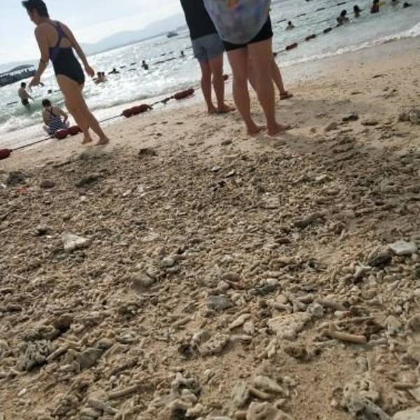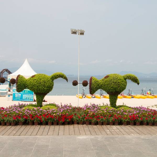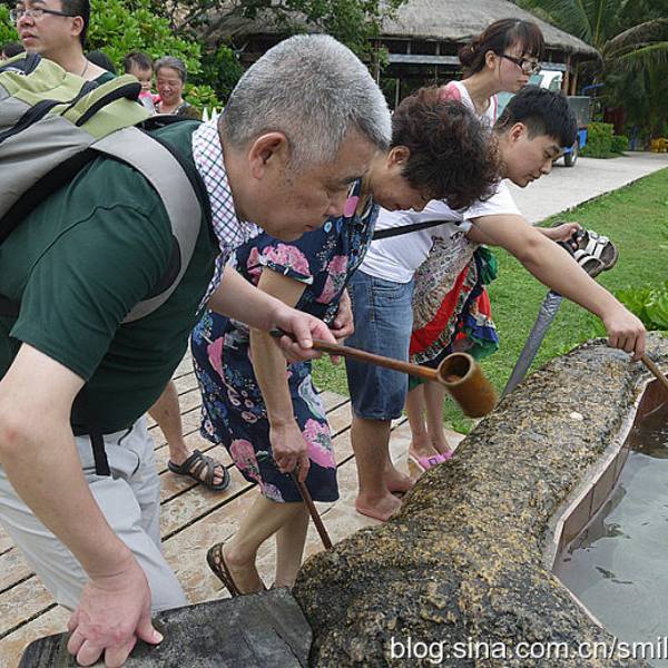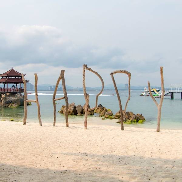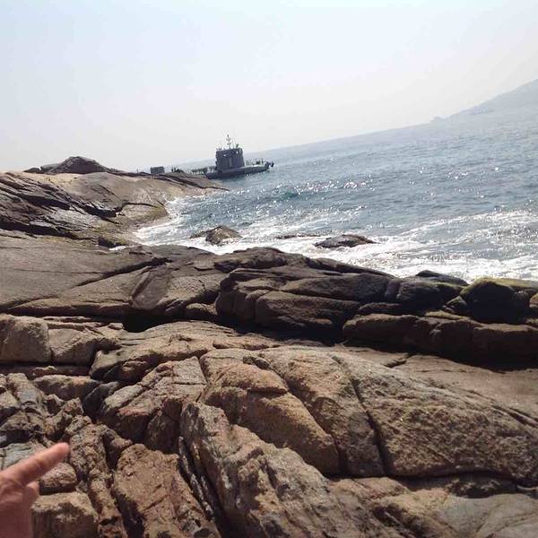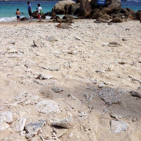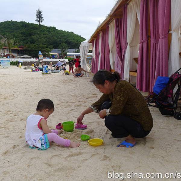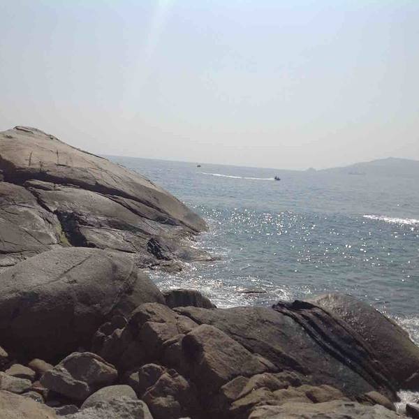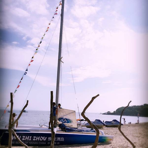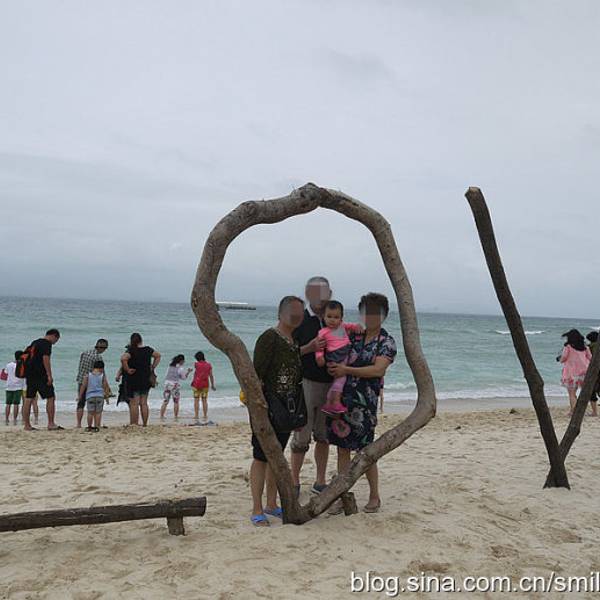 上岛需要坐船,15分钟左右。一上船工作人员就发垃圾袋,后来才发现,由于当天起风,海上这风浪真不是一般大,不少人都吐了。我也难受得要死,娃就在不停地哭。好在返程时风向改变,没怎么晃了。蜈支洲岛,大概就是这种感觉。景点情人桥。感觉这一段的沙滩是最细腻的,适合娃玩。沙滩上用树枝摆了很多造型,love\happy之类,很多人在这里拍婚纱照。蜈支洲岛的沙是珊瑚沙,就是珊瑚碎成粉末状,所以沙是白色的,但这部分还不够细,就很扎脚。上岸后,自己舀水冲脚,勺子太小。岛上好看的树。冯小刚对海南是真爱啊,私人订制在这里拍的。进去有最低消费,40/人,可以游泳喝茶什么的。最坑爹的是岛上这个动物园,就只有几只孔雀、火鸡之类,粑粑超多,很臭。一上岛就是这片沙滩浴场,人最多。但不推荐娃在这里玩,沙子不够细。后来我们也是没时间了,就随便玩玩。这里的遮掩伞都是天价啊,300块/小时。蜈支洲岛是一个心型的岛屿,目前游客可以步行的只有北部半边,南部全部是上图所示的巨型岩石,只能走景区的电瓶车。推荐上岛的话还是另外花钱体验一下,景色很壮美,是和北部完全不同的体验。最低的一档80/人即可。出来玩,有些钱当花还是得花。
