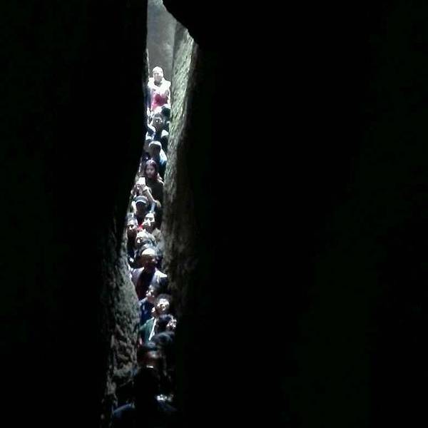 像这样的狭窄 通道 ,景区里有很多处。不会都叫“一线天”,但具体是个什么名字我也说不上来。 比如 在这里就错不开行人,只能单人通过。非要同时错身,那就挤吧: