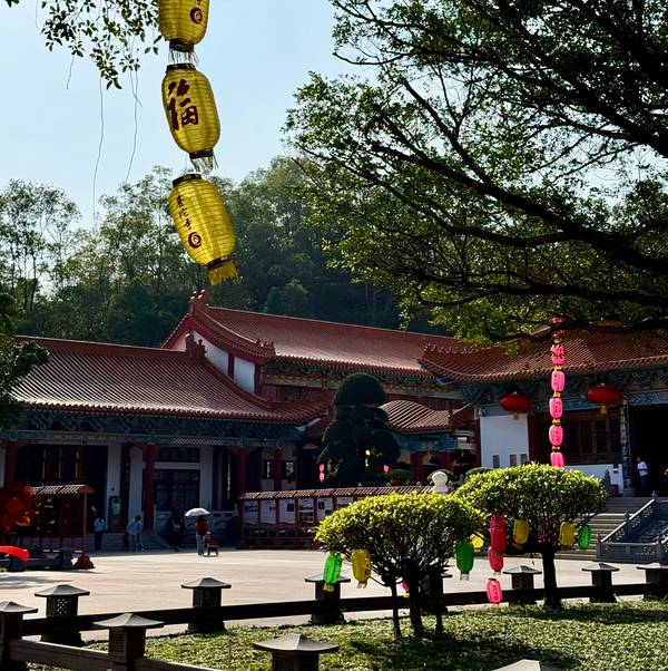 珠海最著名的、最受欢迎的寺庙!在中国的不同地方,都会有自己的普陀寺,而在珠海的香洲区旅游路上,也有珠海自己的普陀寺,乘坐公交26路;36路;70路在普陀寺-公交车站下山后,即可到达。普陀寺距离珠海市植物园、九华圣境、农科奇观等景点都很近,有兴趣可以一起游览。普陀寺是免费参观的,建议游览时间是2个小时。一下车先会看到一个5个拱门的大牌坊,这个牌坊的做功非常精细。穿过了牌坊以后就能看到普陀寺这三个大字,那是一栋对称形的建筑物,穿过这栋建筑物以后,就会看到一个很大的庭院,里面绿化做得很好,空气非常清新。寺庙的环境非常好,不仅有小桥流水,红砖白墙,还挂满了五颜六色的灯笼,就像一条七彩彩虹一样,绚丽多彩,整个寺庙看着挺有江南庭院的风格。庭院里面有大大小小不同的法堂,法堂里面供奉着不同的神明,而每个法堂的设计都很有特色。普陀寺是一个极具观赏价值的寺庙!