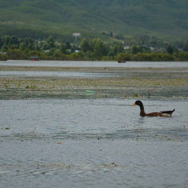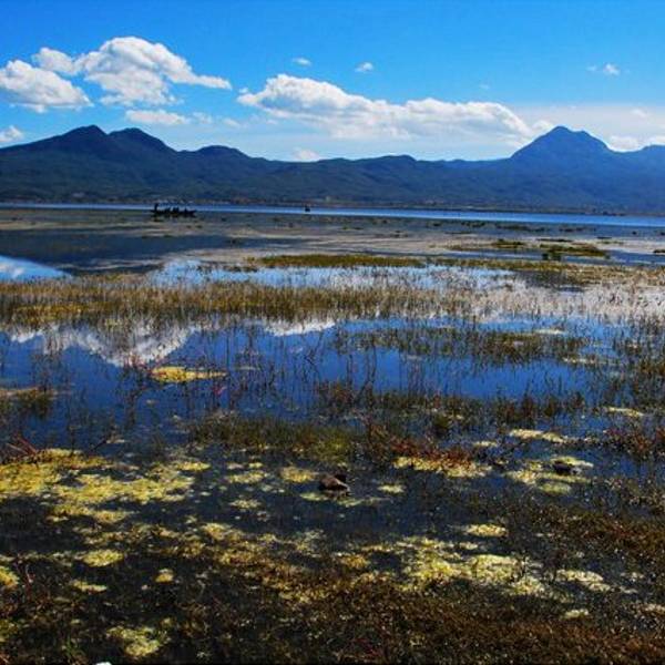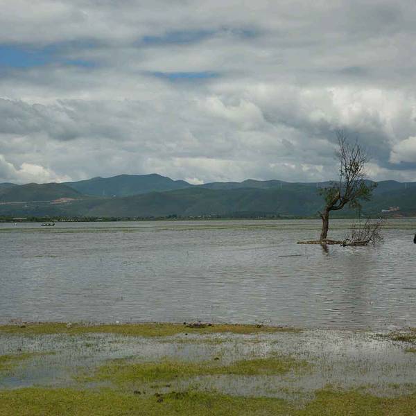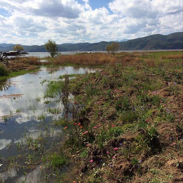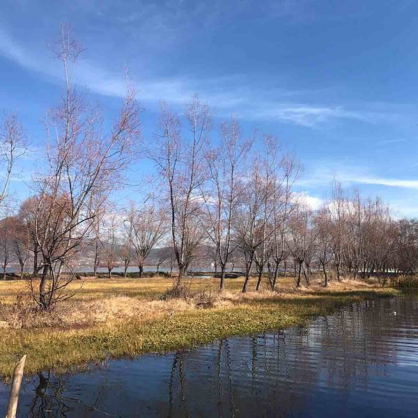 虽然拉市海有些臭名昭著,但风景不可否认的美,这里的春天要来的晚一些,湿地还没翻绿,一块一块圈出不同的湾,平静时可看到天空的倒影,偶有两三只野鸭扑腾着打破水面。