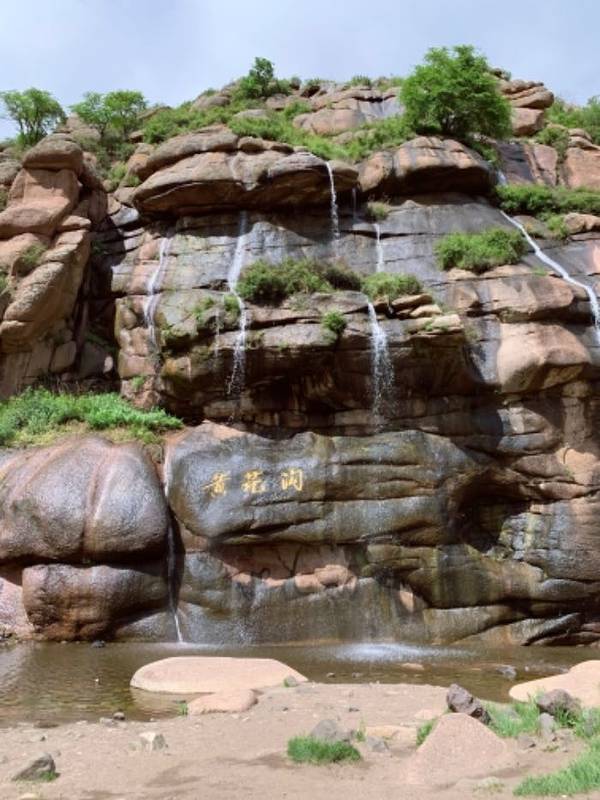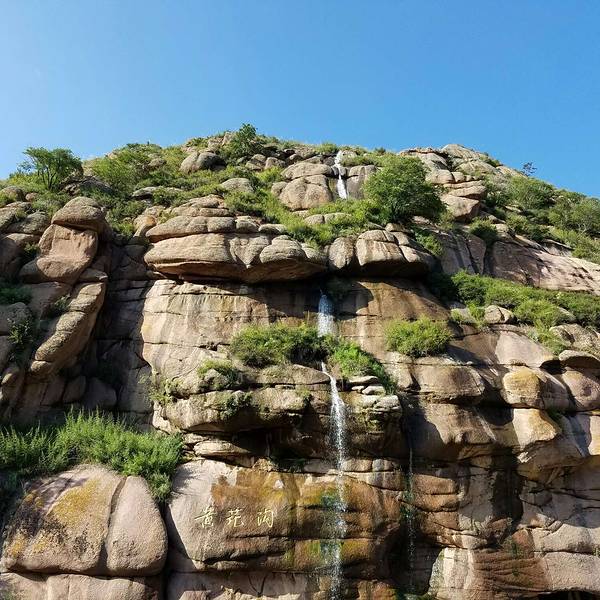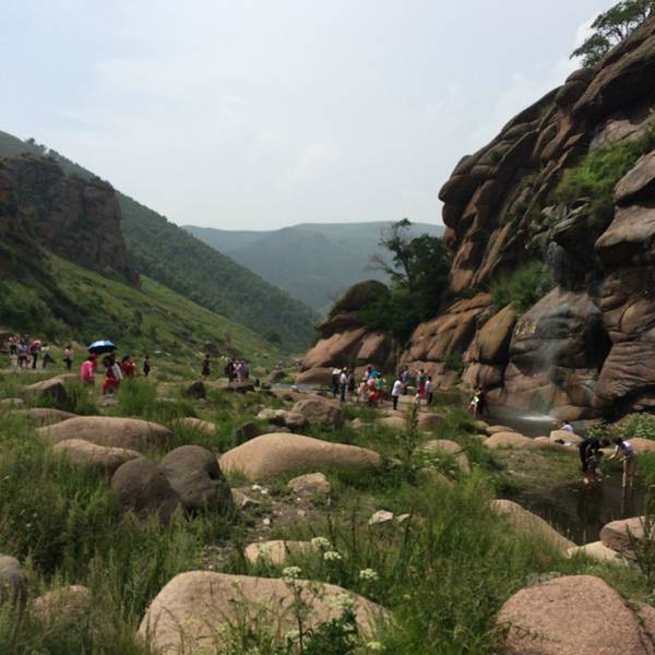 坐索道进入沟底,说实话,那景色就像北京怀柔的郊区,有个大石头山,上面有很小的水流下,好像开了几个水龙头,而且水是人工泵上山顶的,不是自然水源,下面有个乒乓球台大小的水坑,石头山上书三个大字“黄花沟”——这就是主景区?真难以置信。