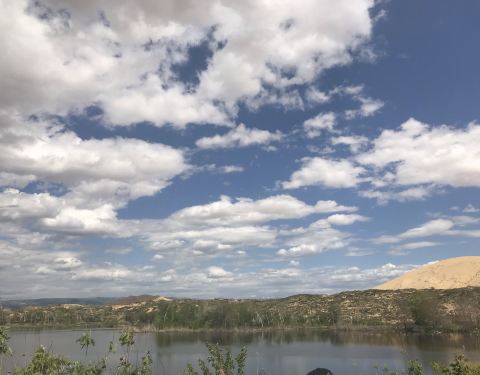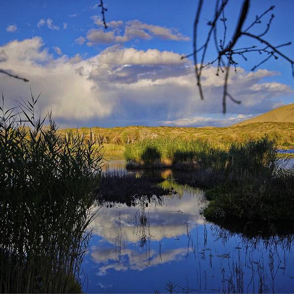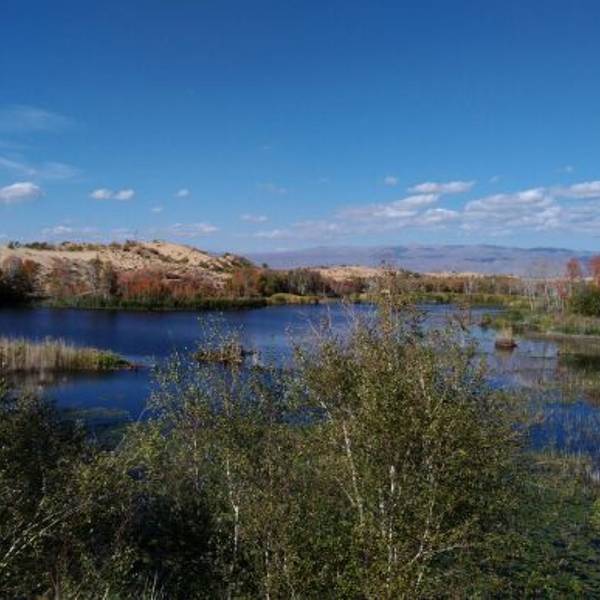 葱郁树木和远处的沙山倒映在湖水里,是摄影的绝佳地带。