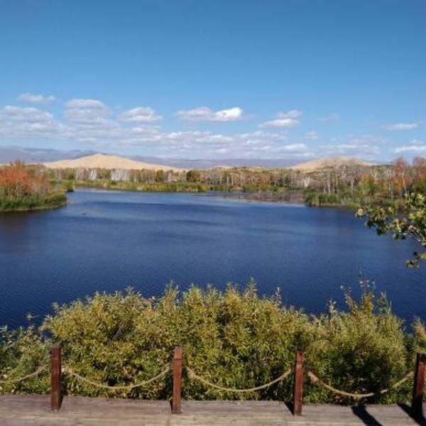 白沙湖位于哈巴河县西北侧的185团三连(由于新疆生产建设兵团是以民兵为主的屯垦团,这里的团和连都是指一个地区,一个连大约相当于一座村子),距离哈巴河县城的车程约70公里,布尔津县城车程约160公里,是一处沙漠环绕的宁静湖泊。白沙湖外围有连绵起伏的沙漠,但湖边却绿树成荫,湖面水波粼粼,强烈对比的画面十分奇幻。每年秋季是游玩白沙湖热门的时节,此时湖边的树叶都变成红黄两色,非常鲜艳,是拍摄红叶好的地带。夏天时前来也很不错,湖中可以看到新疆少见的莲花开放。冬天和初春时这里则会非常寒冷,湖面也会封冻,不适合前来游玩。白沙湖景区的大门位于Z840公路旁,景区大门到湖边还有约2公里的路程,可以步行前往,也可以购买10元的往返车票乘电瓶车直达湖边(电瓶车为循环发车,返回时可以随意乘坐任意一辆)。到达湖边后,便可沿着木制栈道步行游玩。在湖边漫步观光是游玩白沙湖景区主要的内容,湖边的木制栈道大约长1公里,步行在栈道上,可以尽情欣赏树影婆娑的湖滨美景。栈道的尽头是一处观景台,这里观看湖泊的视野比较开阔,对面正好有一座沙山倒映在湖面上,画面旖旎,是拍照好的地方。游玩湖边后,返回景区大门时建议步行。因为在景区大门和湖区之间还有一处沙丘可以游玩,沙丘不高,顶部修筑了一座凉亭,从公路登上凉亭大约需要15分钟左右。由于白沙湖景区离国境线很近,所以附近可以看到对面哈萨克斯坦的风光,而这座凉亭就是附近好的观赏点,可以在此看到对面宁静的村庄和树林,视野非常开阔。另外,返程到快到景区大门时,还有一小片漂亮的白桦林,可以漫步林中,拍摄美丽照片。餐饮住宿游玩白沙湖景区大约需要3个小时左右,游客在游览景区后一般都会在景区附近用餐。景区大门的对面便是兵团185团三连的所在地,连里的居民都是从内地前来戍边的汉族人,自己在小院子里种满了蔬菜,基本上家家都开了餐馆。如果你已经在新疆吃了很久的重口味菜肴,这里味道清淡的正宗汉族农家菜一定会让你有深深的亲切感。而且在此用餐价廉物美,非常实惠。如果是夏秋季节前来,还可以直接在菜园子里指着时蔬点菜,品尝到正宗的新鲜蔬菜。前来白沙湖,一般是从布尔津或哈巴河县城包车前来,两地均可以一日往返,一般游客均会返回布尔津县城或哈巴河县城住宿。两地接待条件都很好,各档次的酒店、青年旅舍都有,选择丰富。