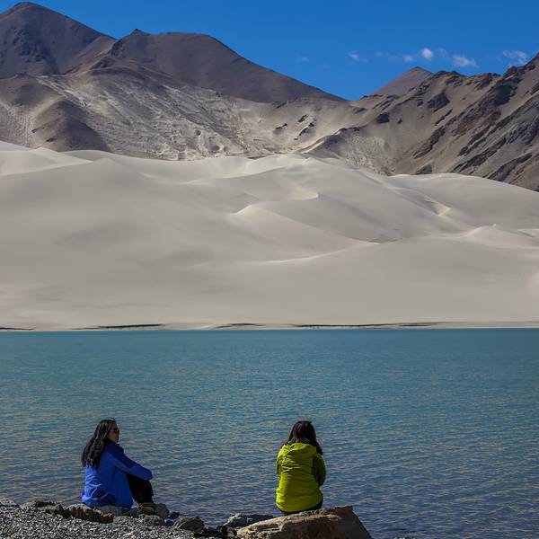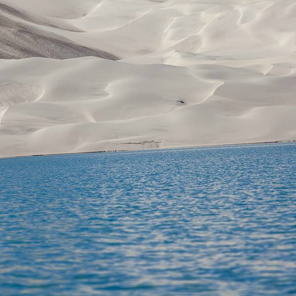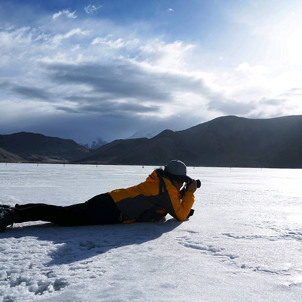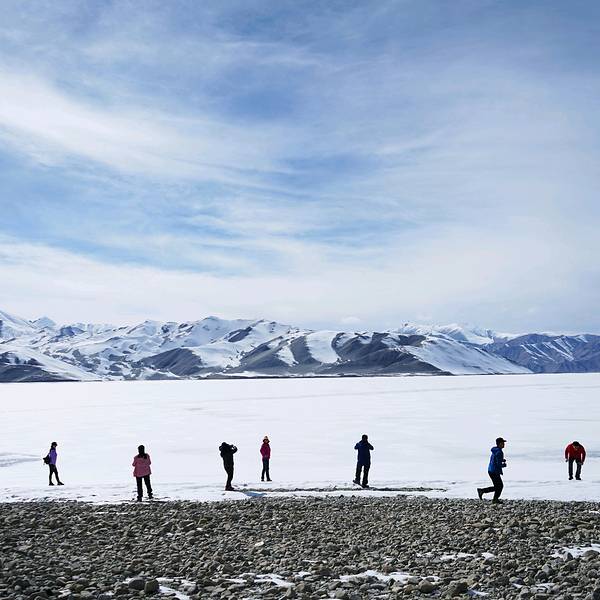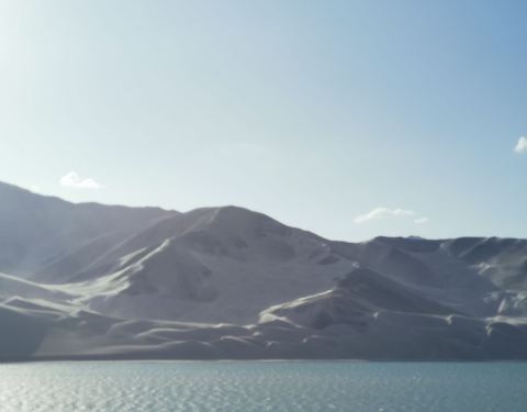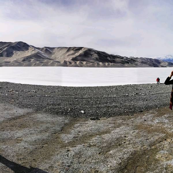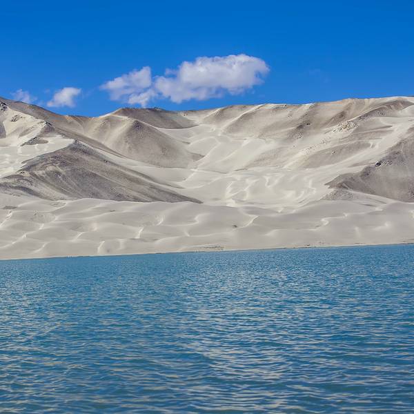 恰克拉克湖是从喀什去塔什库尔干的必经之地,走出盖孜峡谷,在帕米尔高原遇见的第一个湖泊便是白沙湖,依偎在巨大的白沙山旁。河流输送来的水在这里聚集成湖,沉积的白沙则在水位下降的寒冷季节出露,被日夜不停的大风吹上山坡,千万年过去了,便形成了聚沙成山的奇景。白沙湖依傍着一座巨大的白沙山,被淡白色沙尘填去大半面积和深度,像是镶嵌在银色王冠上的一颗蓝宝石。它承接了东帕米尔北部广大地域之间的高山融水,河流到了这里流速减慢,水中的白沙便沉淀到河湖底部。继夏秋的丰水期之后,冬季水位会急剧下降甚至干涸,河床和湖底就会露出。盖孜峡谷是一个大风口,日日夜夜,银白色的沙屑随风扬起,千百年的吹拂和收纳,就有了一座终年被银沙覆盖的白沙山。安静的时候,白色的高原沙山倒映在湖水中,出露于水的沙地布满弯曲的线条,好似一幅抽象派的作品。 展开