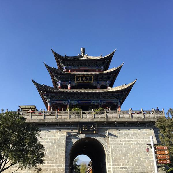 五华楼是可以俯瞰古城的制高点,不收门票,从一家卖玉器手镯的店走上去就是。五华楼前有个广场,晚上当地阿姨们会在这儿围成圈跳广场舞,我和姐姐也凑进去跳了,圈子越绕越大,非常有感觉。