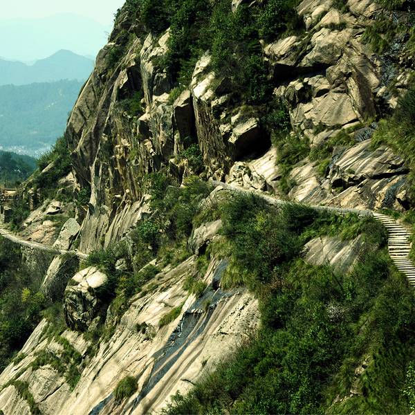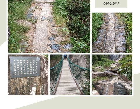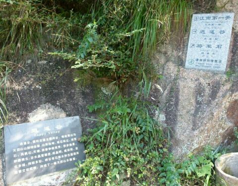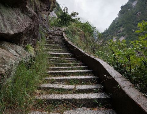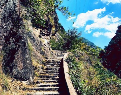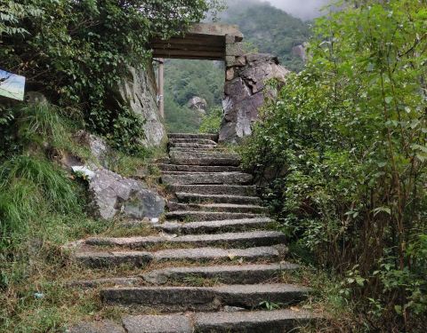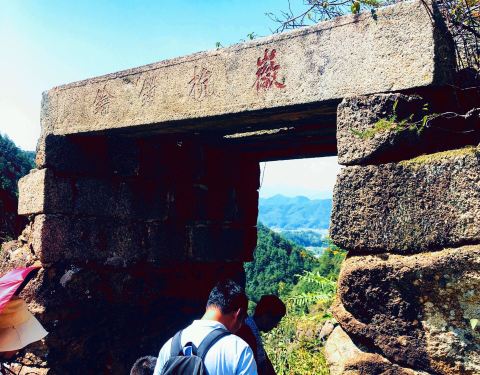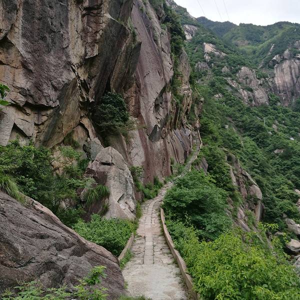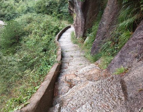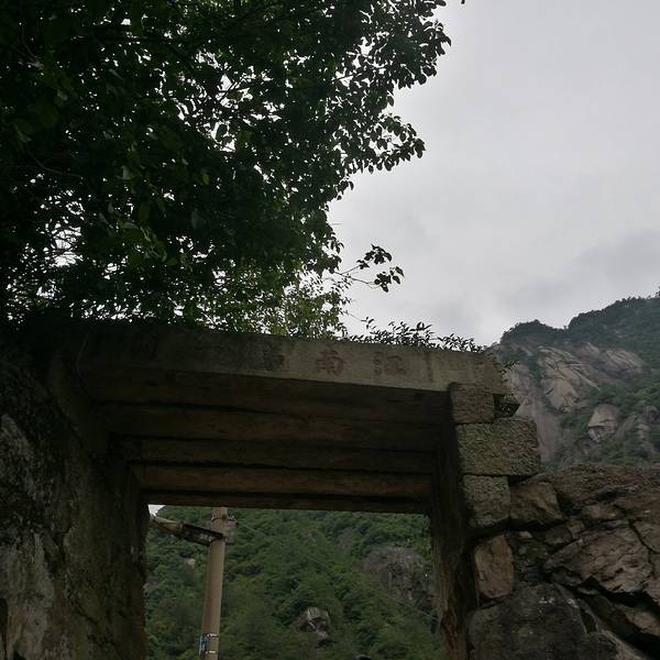 很是险峻!石板路蜿蜒曲折。江南第一关门楣由4根大石条横架天然岩石构成江南第一关门楣由4根大石条横架天然岩石构成。门楣刻有“江南第一关”。路都是石板路,除开这一段,其他没有石板的普通山路。石板路蜿蜒曲折。很是险峻!