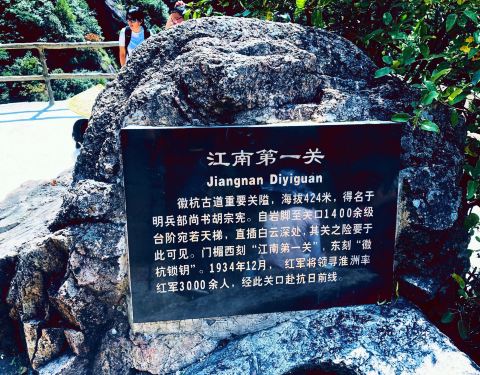 “江南第一关”是徽杭古道重要关隘,关门由四根条横架构成“江南第一关”是徽杭古道重要关隘,关门由四根条横架构成。门楣西刻“江南第一关”,东刻“徽杭锁钥 ”。到达这里后稍许休息一会儿,领略习习山风吹来时的凉爽感觉。