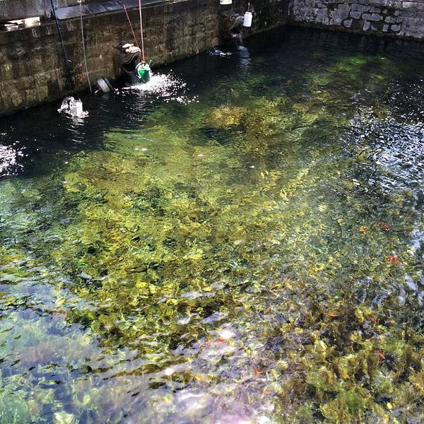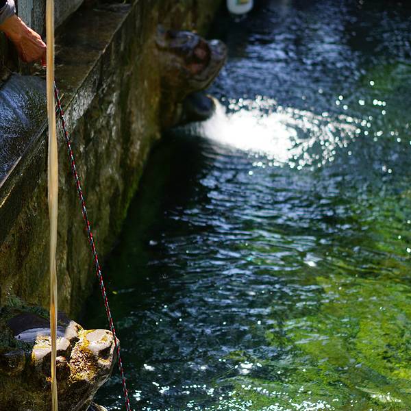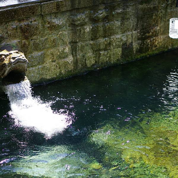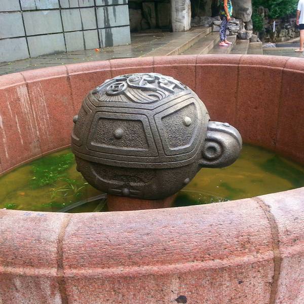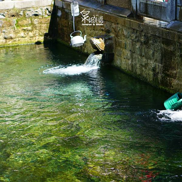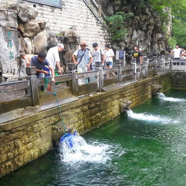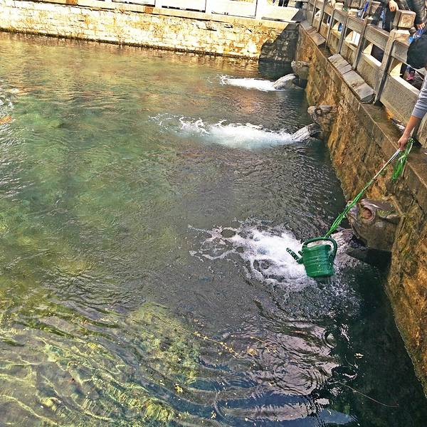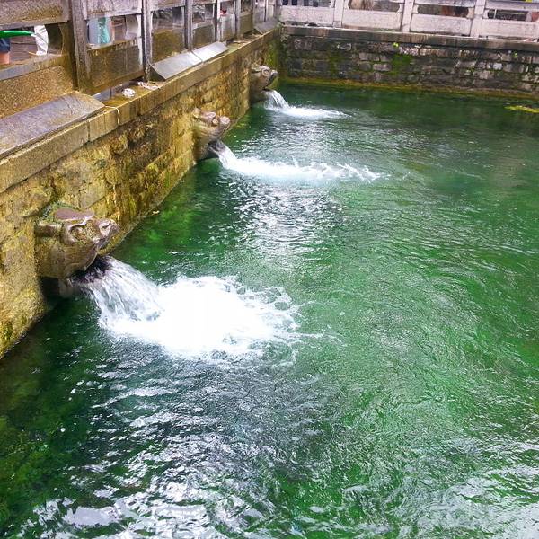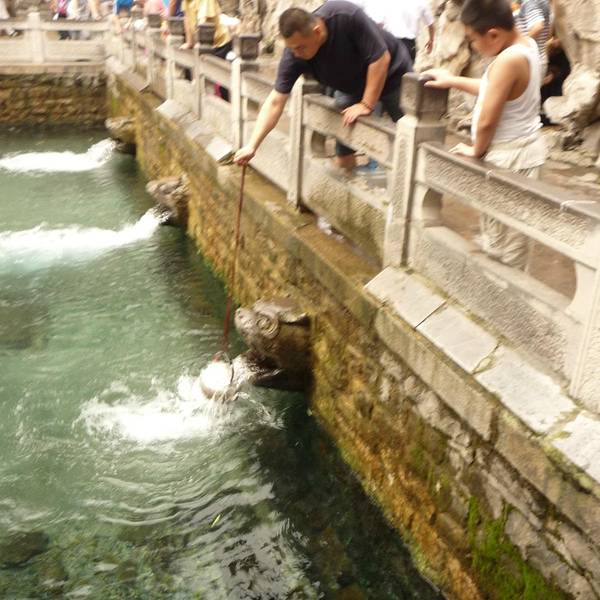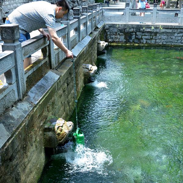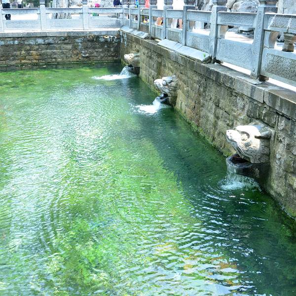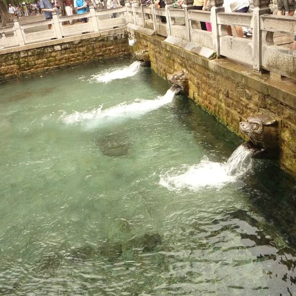 黑虎泉有三个主要的出水口,源源不断的流淌着泉水,装新鲜泉水的池子非常清澈,水是很漂亮的绿色,一下就能看到底的那种,来到这里让人想到水至清则无鱼,看来是这样的道理。整个池子的鱼非常少,可能是太干净了吧并不适合鱼类的生活。