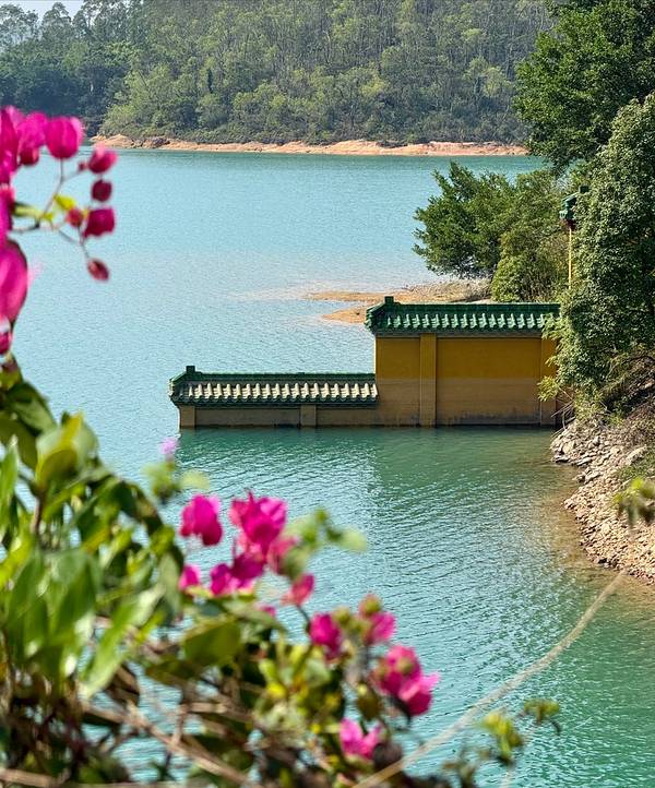 金台寺的颜值堪称岭南古寺的视觉标杆。背靠黄杨山,前拥翡翠般的王保水库,左青龙右白虎的三山一水格局,天生自带山水画质感。水中宫墙、明镜桥是必打卡点位,水面倒影清晰,晴天时湖水呈现渐变的蓝绿“果冻色”,白鹭掠过波光,霞光铺洒时更是美得无需滤镜。沿平缓坡道而上,朱红飞檐、金色琉璃在浓荫中错落,殿宇层层递进,漫步其间,每一步都能邂逅不同的古风构图。