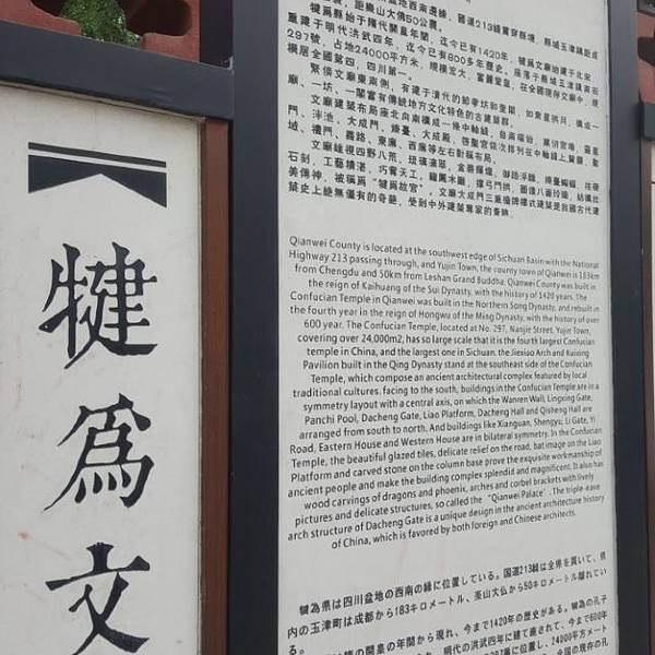 上次来犍为,文庙闭门修缮,没能参观到,这次总算看到了犍为文庙始建于北宋,重建于明代洪武四年,已有600多年历史,在全国现存文庙中,规模居全国第四,四川第一,是全国重点文物保护单位。文庙建筑布局坐北向南构成一条中轴线,自南端始,有万仞宫墙,灵星门、泮池、...犍为文庙始建于北宋,重建于明代洪武四年,已有600多年历史,在全国现存文庙中,规模居全国第四,四川第一,是全国重点文物保护单位。文庙建筑布局坐北向南构成一条中轴线,自南端始,有万仞宫墙,灵星门、泮池、大成门、燎台、大成殿、启圣宫等精美的古建筑。上次来犍为,文庙闭门修缮,没能参观到,这次总算看到了。 展开