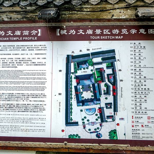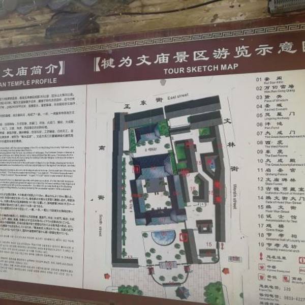 犍为文庙是国家重点文物保护单位,始建于北宋,重建于明代洪武四年,迄今已有600多年历史。文庙经过三次搬迁、三次重建、十二次大型修缮,在我国现存文庙中,规模居全国第四,四川第一。文庙建筑布局座北向南,构成一条约200米的中轴线。自南端始,万仞宫墙、灵星门、泮池、大成门、燎台、大成殿 、启圣宫依次排列在中轴线上,贤关、圣域、礼门、义路、东庑、西庑等左右对称布局。文庙东南侧,有建于清代的节孝坊和奎阁,如众星拱月,构成了一庙、一坊、一阁富有传统地方文化特色的古建筑群。犍为文庙结构完整,规模气势宏大,特别是石刻、雕刻技艺十分精美,其明清风格的宫殿式古建筑群独具特色。文庙内的大成门,将歇山式、牌楼式、悬山式三种屋面融为一体,正中三重檐牌楼镶嵌“天开文运”琉璃文字,使整个屋面华丽高雅,极为罕见,三重檐牌楼建筑已成为当今独特的奇观。始建于建于清代康熙年间的大成殿,气势雄伟,规模恢弘,是国内文庙中不可多见的宫殿式建筑。殿内供奉孔子塑像,以及四配:颜回、子思、曾子、孟子和十二哲人,塑像群多达94尊,规模居全国之首。文庙历经600多年,每一座殿堂和石碑都有其独特的故事。游人徜徉其间,只能看到它的庄严。但如果想了解那些久远的故事,建议约请一位讲解导游。一般5人以内的小团队,讲解员收费30元,5-10人则收费40元,10-20人收费50元。此外文庙也配备英语讲解,不分人数,每次100元。预约讲解可提前拨打电话:0833-4227731。