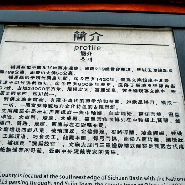 犍为文庙规模宏大,是四川省规模最大的文庙。 文庙建筑石刻石雕工艺精美,极具特色。