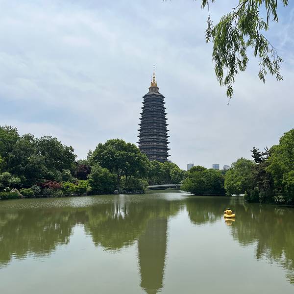 公园免费开放,不难发现江南元素遍布其中。即使天公不作美,依旧有人出来晨练,吹吹小区。公园内的柱形鱼缸,挺有意思。红梅公园扩建于天宁寺北侧,已有千年历史的文笔塔矗立其中。