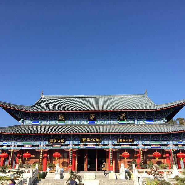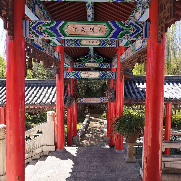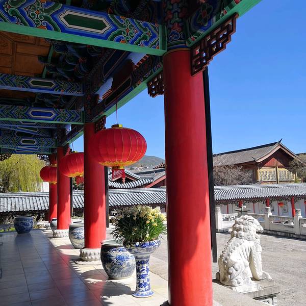 花园回廊,这是丽江的紫禁城。主要有8个点:议事厅,万卷楼,护法殿,三清垫等- 在丽江的第一天,我们去了木府,府内有专业的免费讲解员:“北有故宫,南有木府”。据说很久以前的丽江有个纳西族,一开始士司是没有姓氏的后来朱元璋把自己的姓去了几划,赐予了士司。
