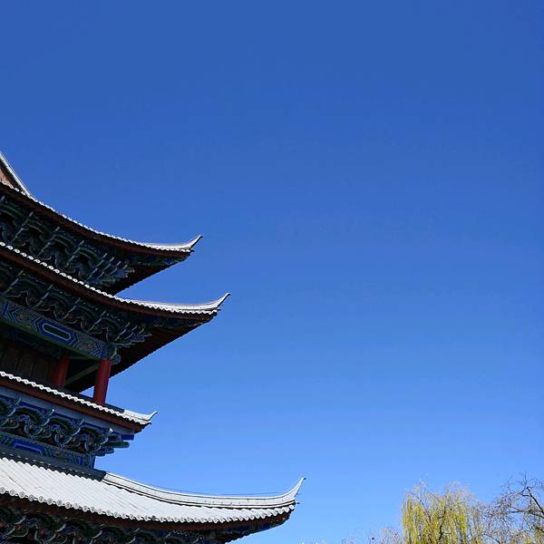 我们没有去玉龙雪山,但是我们去了木府,星期一没什么游客,少得走了一路就几个人,所以古城也没有检查人员在查票了,我们去木府的时候已经是中午了,12点40分这样,我们用学生证买了半价的木府门票,售票员死人脸,冷冰冰地问:“你们买古城维护费没有?”本来还胆战心惊的,被她这么一质问,我们就恼了:“买啦!~就黄色那一小张嘛~!”真是的,转身就进了木府里面,在里面疯狂地照相,出来的时候已经2点了,就可以看到穿着黑色衣服的收取古城维护费的工作人员,像黑无常一样检查着进入木府的游客。