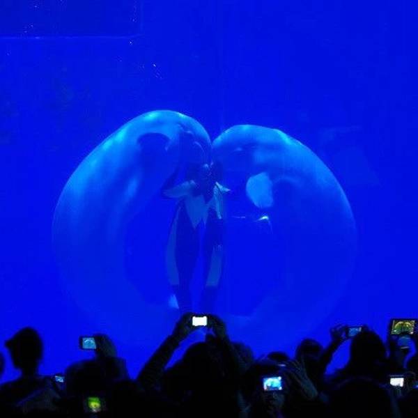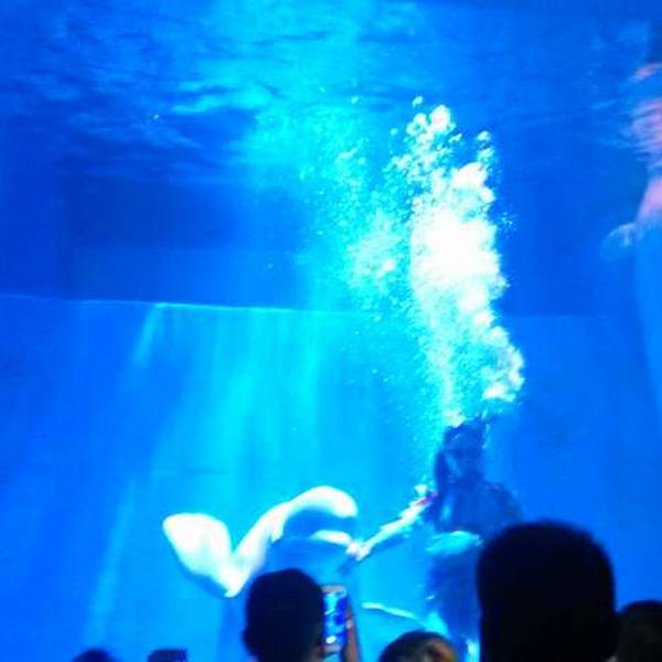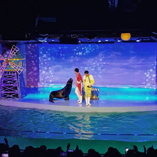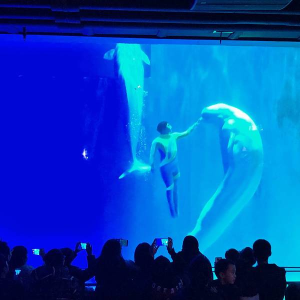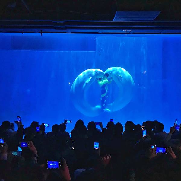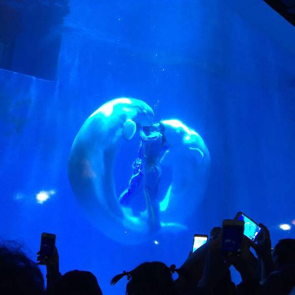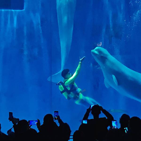 因为人太多,我们又在两个地方观看,所以等了好一会儿汇合了以后再往外走,堵人都堵了好久,我们决定直接前往白鲸表演的地点占个好位置,顺便休息下,等待12:00的表演。白鲸表演的海洋之心是作为极地馆的宣传画吸引我过来的,画面十分唯美。整个表演是一个完整的故事,举世闻名的极地白鲸米拉和尼克拉与他们挚爱的美女驯养师“鲸灵公主”相恋。有浪漫的“天使之吻”,还有永恒的“海洋之心”,让人无限神往。