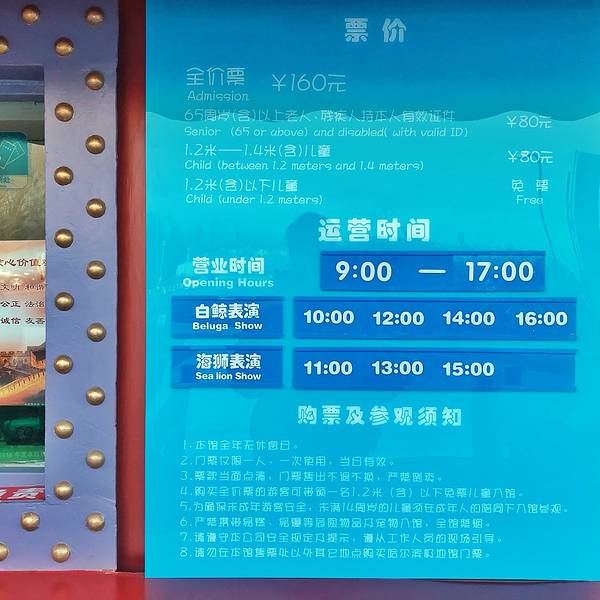 极地馆是中国首家以极地动物娱乐表演为主题的情景式主题公园,位于松北区太阳岛上,从中央大街打车过去也就20分钟左右的车程,20元左右。门口售票处购买票价为130/人,进去看到提示说14:30有一场白鲸表演,于是径直走去看表演,15:30还有海狮表演。建议大家合理安排好时间观赏。