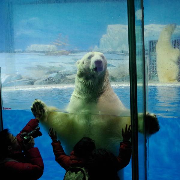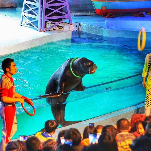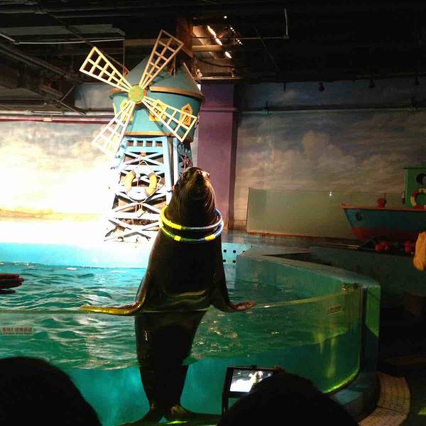 金骆驼 很美的观赏点,鱼全围着中间的水柱游动,仿佛置身海洋。这北极熊跟我们互动玩的可开心了,太巨大了极地馆的场馆不大,但结构很紧凑,只能单向走动。白鲸表演时间为10:00,12:00,14:00,16:00;海狮表演时间为11:00,13:00,15:00。我们十点多到的,为了赶11点海狮的表演一路赶过去,穿过拥挤的人群,准备看完海...极地馆的场馆不大,但结构很紧凑,只能单向走动。白鲸表演时间为10:00,12:00,14:00,16:00;海狮表演时间为11:00,13:00,15:00。我们十点多到的,为了赶11点海狮的表演一路赶过去,穿过拥挤的人群,准备看完海狮表演再重新走一圈。场馆不算太大,而且挤满了人,场馆内许多售卖员在走动,卖爆米花的、饮料的,外观很吸引人价格也略高。我们三个人只找到了很偏的位置,于是我站到最后一排看正面的表演,海狮表演还是很精彩的,海狮时而憨态可掬、时而捉弄主持人、时而灵活地跳跃。