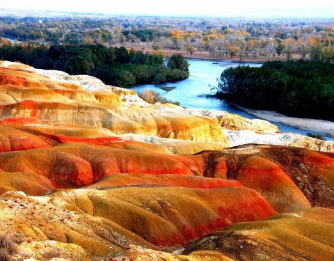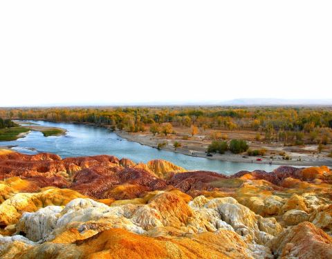 布尔津往哈巴河县方向走23公里处 省道左边额尔齐斯河五彩湾。