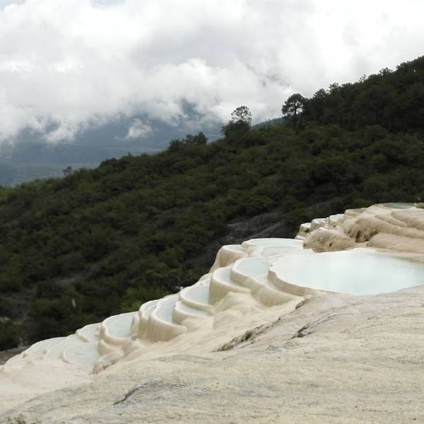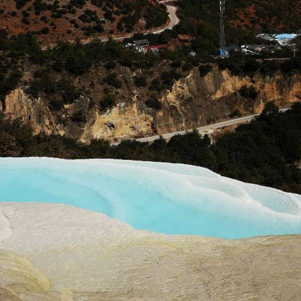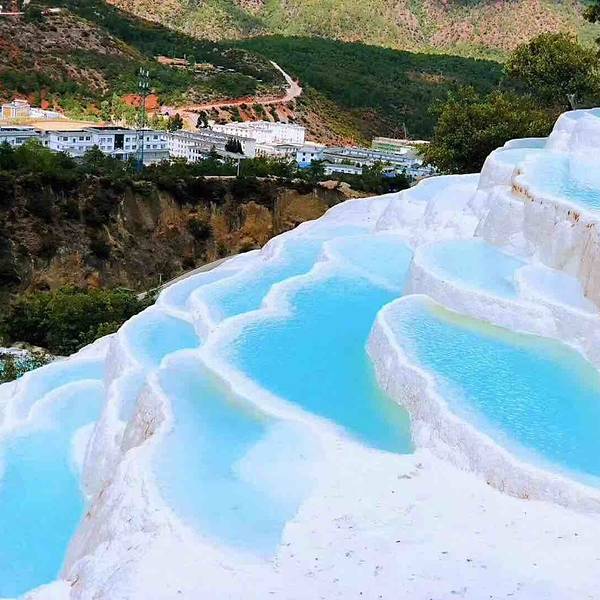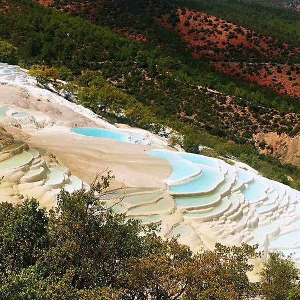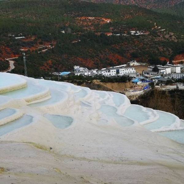 云南也有“土耳其棉花堡”,它就是白水台,位于香格里拉县三坝乡,距离香格里拉县城约一百公里。郁郁葱葱之中露出白色的华台,层层叠叠,仿佛一片白色的梯田。相传,纳西族的神灵为了让人们学会种田耕地,特地变幻出这样一片梯田,后人称之为“仙人遗田”。 白水台不仅是一个风景秀丽的地方,也是纳西族东巴教的发源地。每年农历二月初八,是纳西族一年一度的“朝白水”活动,四里八乡的藏、纳西、彝、白、傈僳等民族都会到汇集于此,用歌舞和野餐进行祭祀活动,向神灵祈求来年的丰收。