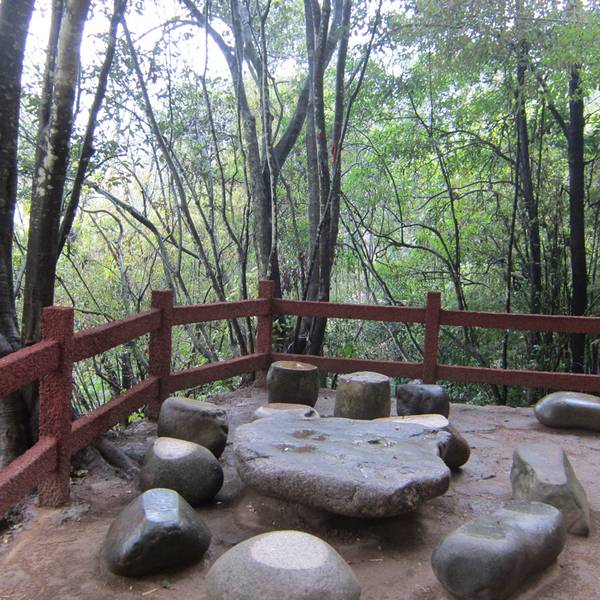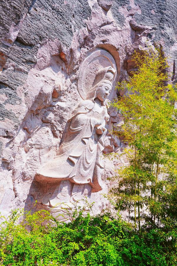 小径两旁,茗丛映带,茶叶飘香,恍若仙境,故名坡仙带。悬崖的石壁上雕刻着大型的观音像结束了三个多小时的登天游之旅,我们赶往下一个景区——虎啸岩。虎啸岩蟠踞在一线天北面,相传曾有仙人骑虎吼啸其上,故名。