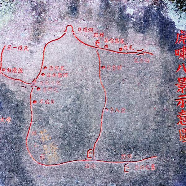 虎啸岩四面陡峭,巍然独耸,周围怪石峥嵘,青藤垂蔓,独具泉石天趣虎啸岩四面陡峭,巍然独耸,周围怪石峥嵘,青藤垂蔓,独具泉石天趣。 白莲渡、集云关、坡仙带、普门兜、法雨悬河、语儿泉、不浪舟和宾㬢洞诸景“兼撮三十六峰之胜”。