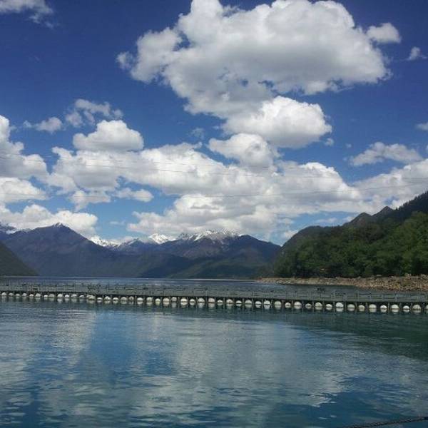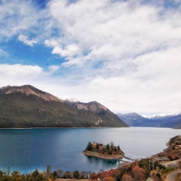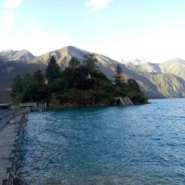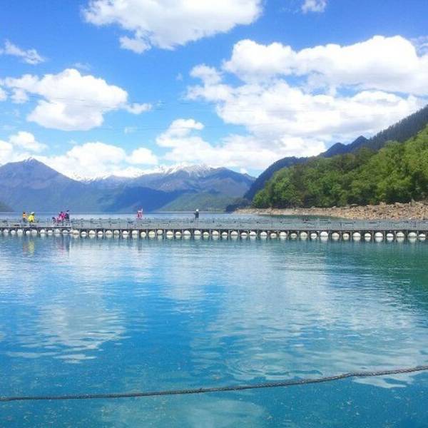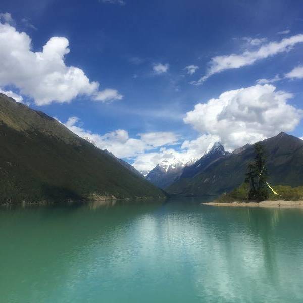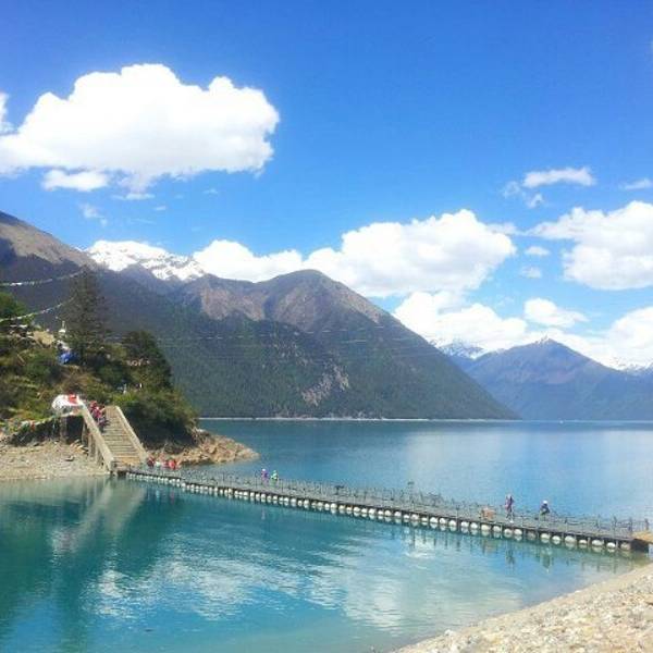 是三大圣湖之一,绿色的河水,跟尼洋河一样。湖面很开阔,岛中央的寺庙很漂亮,周围花团锦簇。