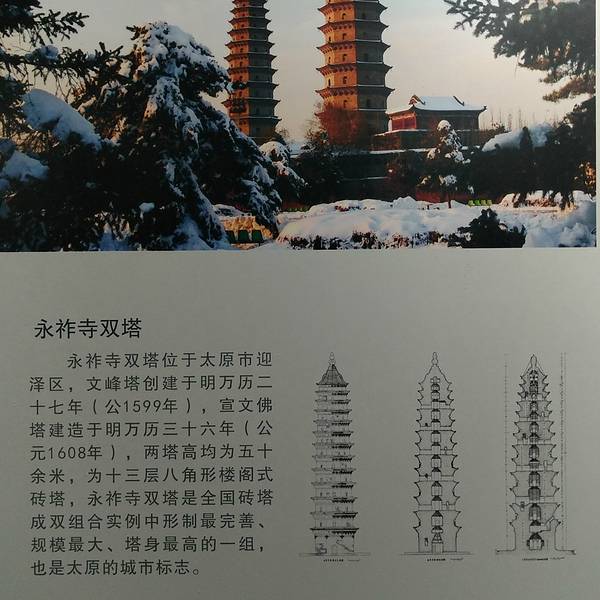 实用 好像是淡季票价。双塔是太原最高的古建筑,几百年来也一直是太原的象征。漂亮的砖雕斗拱。双塔其实在寺外永祚寺,民间俗称双塔寺,位于太原市区东南约3公里的郝庄村南山岗上。2006年被列入全国重点文保名录。拾阶而上,首先映入眼帘的是山大王,哦不,收费处。为了看双塔,这票价也不算冤。好像是淡季票价大雄宝殿五间...永祚寺,民间俗称双塔寺,位于太原市区东南约3公里的郝庄村南山岗上。2006年被列入全国重点文保名录。拾阶而上,首先映入眼帘的是山大王,哦不,收费处。为了看双塔,这票价也不算冤。好像是淡季票价大雄宝殿五间为结构精巧的两檐楼阁式,全用青砖磨砌成柱、檐、斗拱、雀替、垂花柱及图案等,仿木结构筑砌,殿内施拱券顶,不用一钉一木,是明代典型的无梁式建筑,故称“无量殿”。大雄宝殿顶上建有三圣阁,单檐歇山顶建筑,顶部用砖雕斗拱,层层出挑,叠涩而上,形成套拱,筑成下大上小的砖砌藻井,是中国古建筑无量式殿阁中的珍品。礼佛院里的大雄宝殿进殿之前,抬头仰望佛塔,崇敬之心油然而生。漂亮的砖雕斗拱清晨的双塔剪影分外迷人,嗯,要多谢雾霾天。双塔的详细说明双塔其实在寺外两座塔建造有先后,但外观区别不大,高度均为54米,南北相峙。双塔是太原最高的古建筑,几百年来也一直是太原的象征。沿着狭窄的楼梯,我手脚并用地登上了塔顶,体会了一下成就感,或者更确切说,“坐牢”的感受。 展开