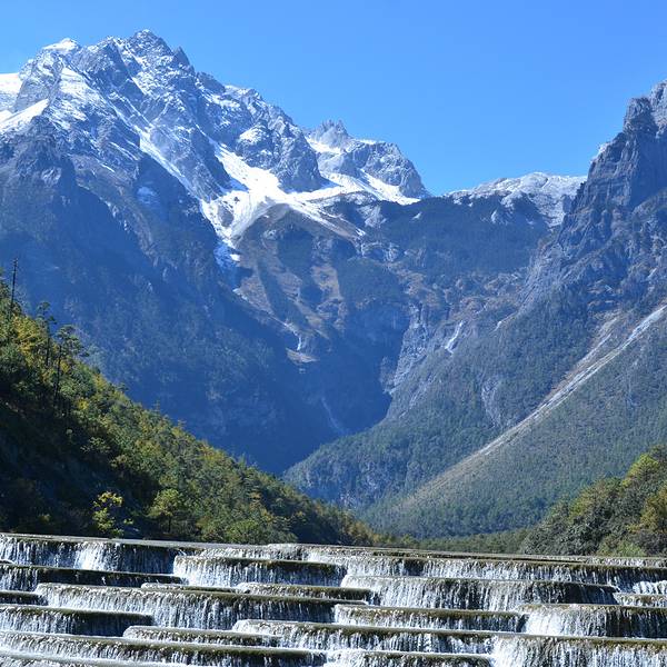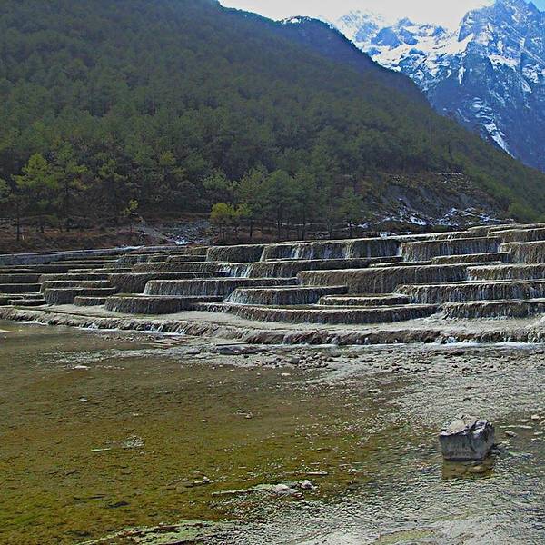 源自雪山冰川的万古冰雪消融之后顺着峭壁流淌而下,不断汇集为山涧、溪流,最终在蓝月谷上游深谷之中形成了清澈见底、甘冽无比的河流,因河床由白色石灰岩构成,使整条河水呈现出白色光泽,显得分外纯净,故得名“白水河”。