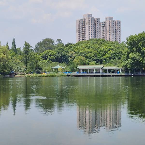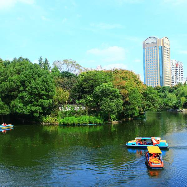 在鲁迅公园里,有不少的水域,种植着大片的荷花,来这里的时候是夏天,现在这个季节正是观赏荷花的最佳季节。粉红的荷花已开始吐艳,红花也需绿叶的衬托。除了含苞的荷花,也有一些已经盛开,开的肆无忌惮。鲁迅公园位于城市中心,旁边尽是高楼大厦。炎炎夏日正适合玩水,这里也有游船游乐项目,许多小船都飘荡在湖面上,同时公园里也是当地人锻炼的场所,专门开辟出了羽毛球场等供游客锻炼身体之用。