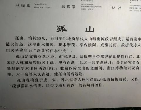实用 这边的景色非常棒,而且人文景观的文化底蕴深厚,自然景观奇特。地铁的话,你可以乘坐1号线在龙翔桥站下车【景点概况】孤山的意思就是单独的一个景点,周边没有其他景点,这边的环境是非常不错的,在唐代诗人白居易的诗歌当中有“蓬莱宫在水中央”的美称。南宋时期,在这里兴建了四圣延祥观和西太乙宫,作为御花园,清...【景点概况】孤山的意思就是单独的一个景点,周边没有其他景点,这边的环境是非常不错的,在唐代诗人白居易的诗歌当中有“蓬莱宫在水中央”的美称。南宋时期,在这里兴建了四圣延祥观和西太乙宫,作为御花园,清康熙年又辟为行宫所在地,这边的主要景点有西湖天下景、中山公园、放鹤亭、西冷印社、秋瑾墓等胜迹。除了游览景点外,你还可以到这里品尝一下杭菜风味,孤山既是风景胜地,又是文物荟萃之处,南麓有文澜阁、西湖天下景、浙江博物馆和中山公园,山顶西部有西泠印社,西麓有秋瑾之墓,东北坡有放鹤亭等。其中放鹤亭是为纪念宋代隐居诗人林和靖而建,他有梅妻鹤子之传说,亭外广植梅花,为湖上赏梅胜地。这边的景色非常棒,而且人文景观的文化底蕴深厚,自然景观奇特。【门票信息】孤山是免费对外开放的,是不需要购买门票的。【旅游时间】孤山的旅游时间以春秋冬季最佳,每年的3到5月份,阳光明媚,天气晴朗,而9、10月份,秋高气爽,万里无云。冬季时节,断桥残雪,素裹西湖,别有情趣。【交通情况】你可以选择公交和地铁两种方式到达孤山,公交的话乘坐k850、游10到西冷桥站下车,或者乘游1、2、3路等公交到岳庙站下车,步行即可到达。地铁的话,你可以乘坐1号线在龙翔桥站下车。春天的时候杏花盛开,杨柳依依,湖面清澈,环境优美,整体上确实非常不错的,是踏青放松休闲的最佳去处。可以体验一下生活之外的放松之感,感受美好的景色。 展开