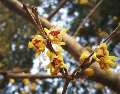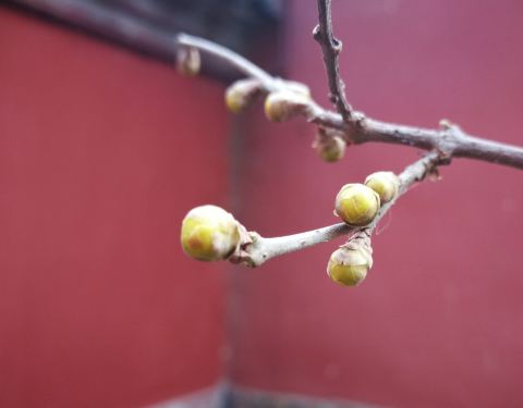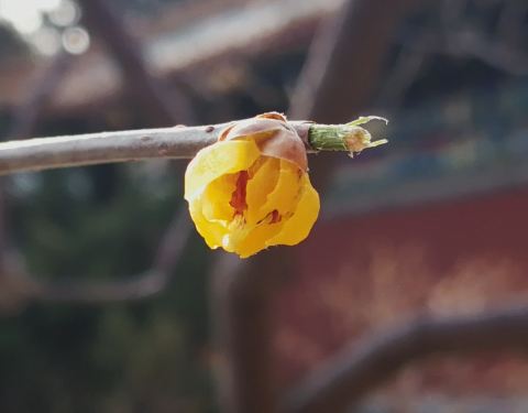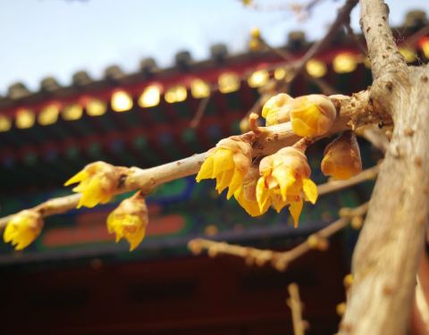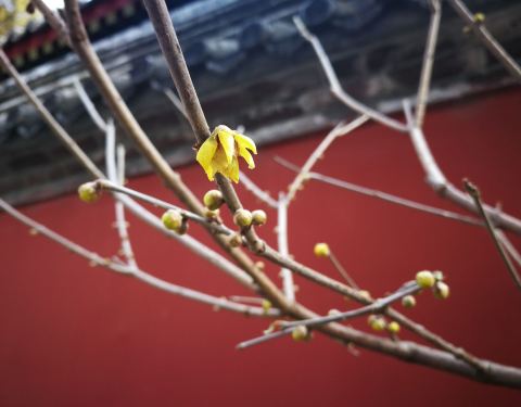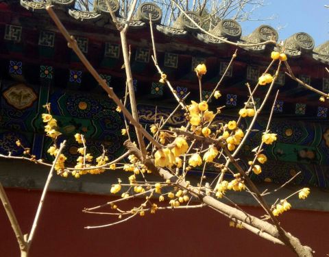 北京植物园卧佛寺,位于北京的香山脚下,素来是京城赏蜡梅的胜地,蜡梅盛开之时金灿灿的花朵开满枝头,在古瓦红墙的映衬下更显亮丽看得人心头一醉。