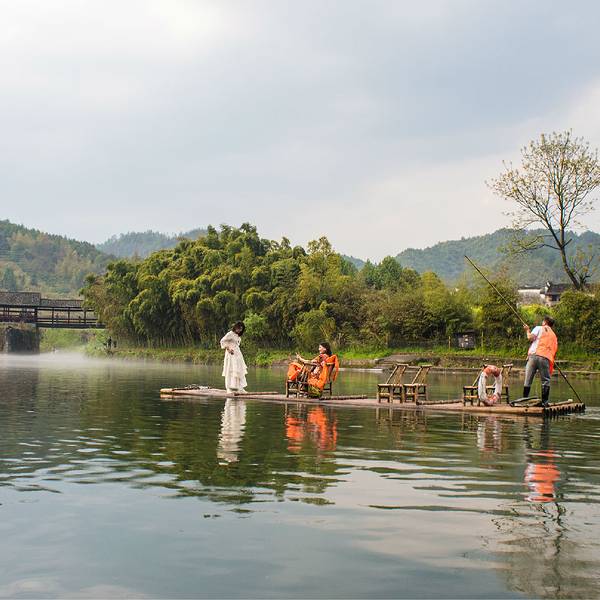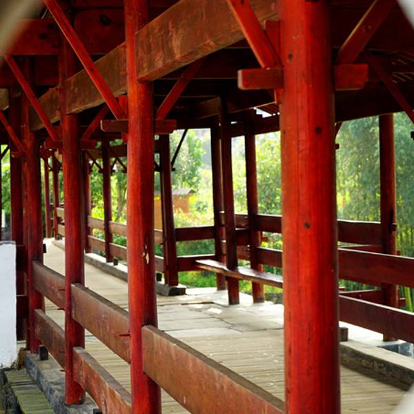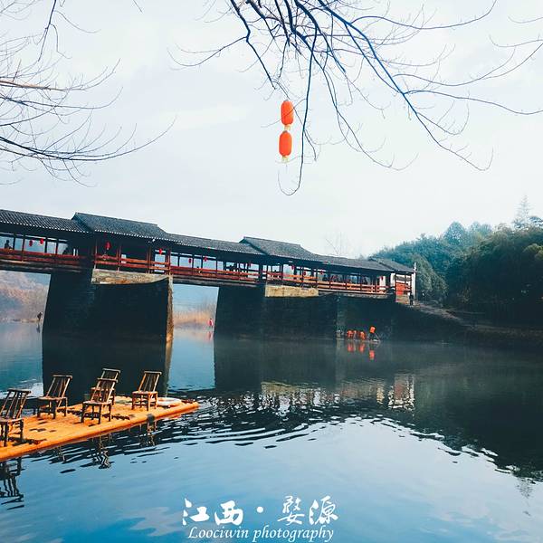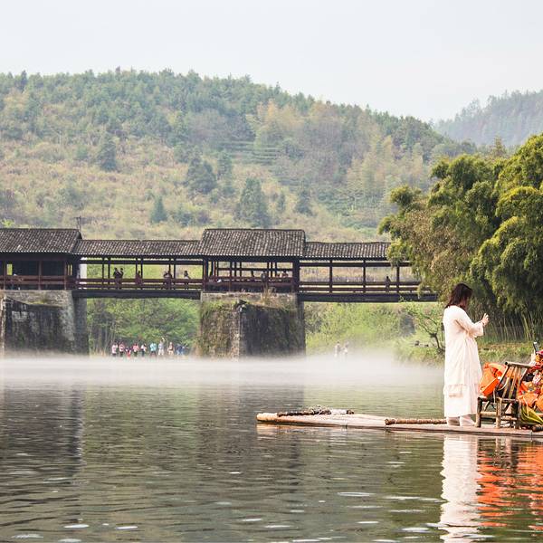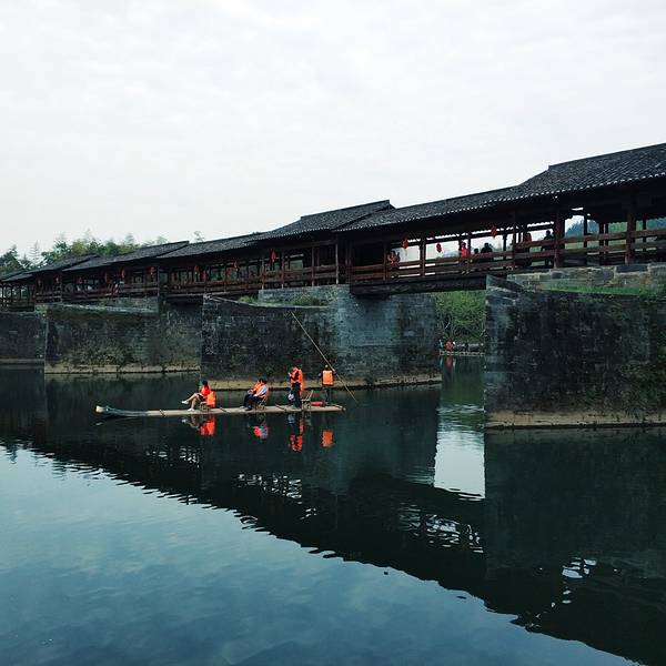 彩虹桥长140米,由六亭,五廊构成长廊式人行桥,每墩上建一个亭,墩之间的跨度部分称为廊,因此,也叫廊亭桥,从远处看,亭略高于廊,形成错落有致。 整座桥为了便于维修,化整为零,每个亭、廊都是独立的,这样做不会因为一处坏而影响到整座桥。这座经历百年风雨依然屹立不倒的廊桥静静的守在他的小西湖身边,三座如舰船状的桥墩迎着水流,溅起层层薄雾,就像铁索连环破风而来。11个人的竹筏缓缓的漂泊在清澈的水面上,远处的白衣女子站在筏子的前端,恰到好处的唯美便呈现在大家眼前,然后一起起哄:女神!女神!……其中桥墩是整座古桥最精美的部分,体现了古朴厚重的艺术风格,历史的存积感很强。彩虹桥周围景色优美,青山如黛,碧水澄清,坐在这里稍作休憩,浏览四周风光,会让人深深体验到婺源之美。附TIPS: