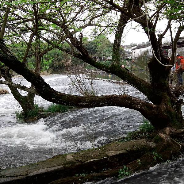 彩虹桥前有铺着小石墩(蹬步桥)供行人行走过河,只允许单向行走,走在上面有点刺激过瘾。从彩虹桥这边走过来看到一片竹林,很有田园气息,走过这个木桥可以看到旧时村里的水车磨坊。太阳慢慢地钻了出来,此时河面上的雾慢慢地减少,远处树林的能见度变高。看着小竹排在岸边静悄悄的,显得怡情。虽然太阳是慢慢出来了,但是因为云太多,厚厚的云层让天色并不显得明亮。也许是大清早,彩虹桥景区并不算多人,所以不会让人觉得人山人海很压抑,这个景点也给人一种原生态的感觉。此时,彩虹桥才完完全全地露出了真面目,看清楚了桥的轮廓以后,才不得不佩服古人建桥的技术。桥墩像半个船形,前面丰锐,后面平整,流线形,起到分解洪水对桥墩的冲击力。正是由于科学的设计,古桥能保存到今天,历史上曾记载,最大水位接近桥面,当时洪水汹涌,假如墩头是平面的,桥早已被洪水冲毁【观后感受】