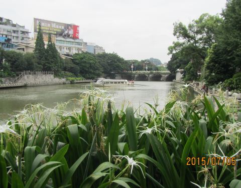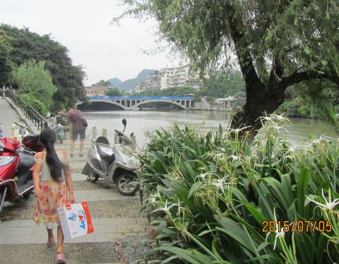 桃花江是桂林市两江四湖游其中之一,它比四湖水位低,这次碰上桂林市下雨,江水上涨,将文昌阁码头都淹没了,影响了两江四湖夜游,去时看到工作人员正冲洗码头。从文昌阁码头坐船要经过船闸才能进入四湖景区,白天沿着桃花江走走,欣赏两岸风景,看人钓鱼,还是挺舒畅的。
