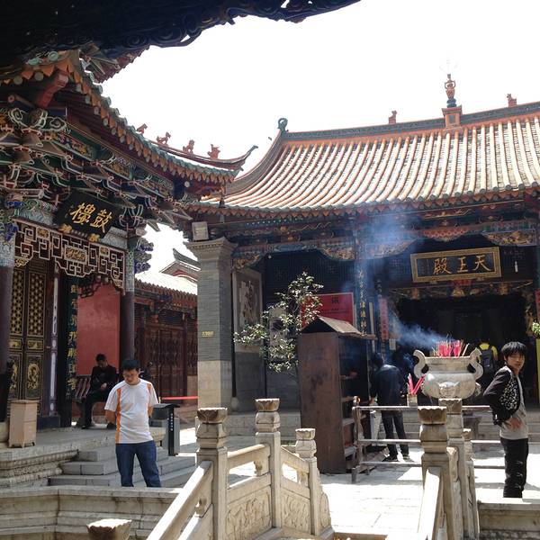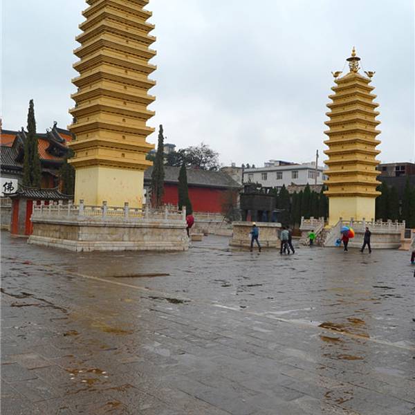 官渡古镇位于昆明东南郊,是昆明知名的历史文化古镇之一,明清时候就已是商业、手工业发达的集镇。古镇内人文景观丰富,有五山、六寺、七阁、八庙,各种店铺也都热闹齐全,是昆明周边逛街游玩的好去处。 唐代时期“窝洞”(即官渡)便是南诏、大理国的王公贵人游览滇池时理想的驻足之地,官渡古镇里建造时间较早的寺庙就在此时,即供奉摩诃迦罗(大黑天神)的土主庙。土主庙前廊后厦,规模宏大,富丽堂皇。另一座古寺法定寺虽然不如土主庙那么庞大恢弘,但也精雕细琢,建筑精美。 来到官渡古镇,除了观赏那些古意浓郁的寺庙和人文景观,一个重要的目的就是吃小吃。就是官渡粑粑,当地人称:麦粑粑。古镇内有名的当属位于古镇金刚塔商业街的眼镜粑粑,每天买粑粑的人都排长队,以胡麻馅儿和花生馅儿两种相当畅销,去古镇一定要记得买来尝尝。