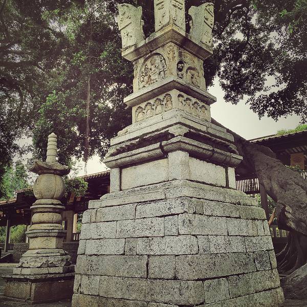 开元寺位于泉州市鲤城区西街,建于唐武则天垂拱二年,至今已有1300多年的历史,是我国东南沿海重要的文物古迹,也是福建省内规模较大的佛教寺院。 寺院的景点沿着中轴线有拜亭、拜庭、大雄宝殿、桑蓬古迹、甘露戒坛、藏经阁等。此外,还有东西两侧的石塔和东西两廊。 天王殿也就是寺院的山门,现存建筑是公元1925年修建的。石柱上下端略细,中部较粗,呈梭子状,为唐朝的石柱风格。石柱上还悬挂有一木制对联“此地方称佛国,满街都是圣人”。这是南宋大理学家朱熹所撰,近代高僧弘一法师所写的。 跨过山门就到了拜亭,站在这里,可以看到拔地而起的东西两塔和宽敞明亮的东西两廊对称地排列在两旁。东西两塔是景区较有名的景点,东为“镇国塔(东塔)”,西为“仁寿塔”,它们高40多米,是我国很高的一对石塔,也是泉州古城的标志和象征。 拜亭前有个大石庭,供古今官民朝拜和活动,每当有活动的时候就特别热闹。石庭两边分列着八棵大榕树,树下排列着11座唐、宋、明时期不同形式的古经幢、小舍利塔,以及两只贔屃 。 然后就是主建筑大雄宝殿。大雄宝殿还有一个“百柱殿”的雅称。全殿原计划设立柱子一百根,后来因为需要放置佛像和腾出给佛教朝拜的地方,便加长了珩梁,减少了立柱,成为86根柱子的“百柱殿”。