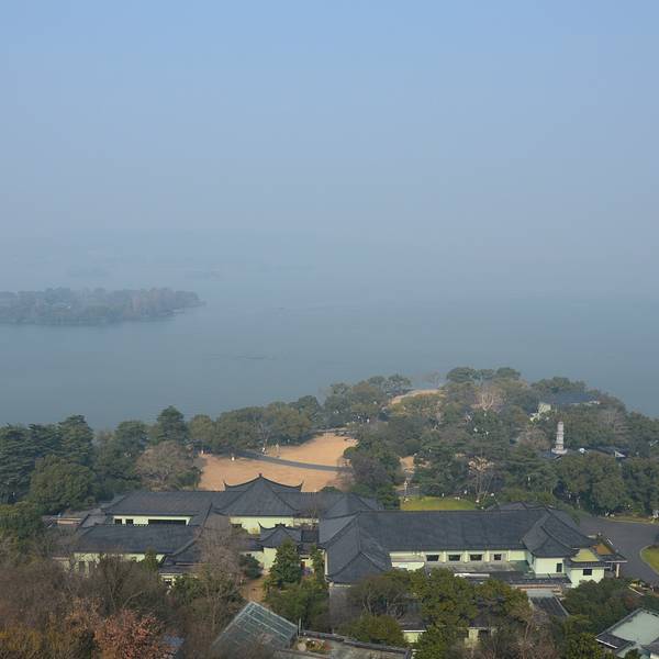 上塔有电梯的,冬天人不多所以排队就几分钟,不得不说塔顶的西湖风景太棒了,能见度没有很高只能看到不到半个西湖吧。可有点雾蒙蒙的这种感觉也是很奇妙的,在北方冬天真的没办法看到塔底这种连片的绿色。塔顶还有特别多的自拍党哈哈。