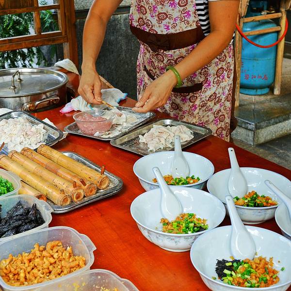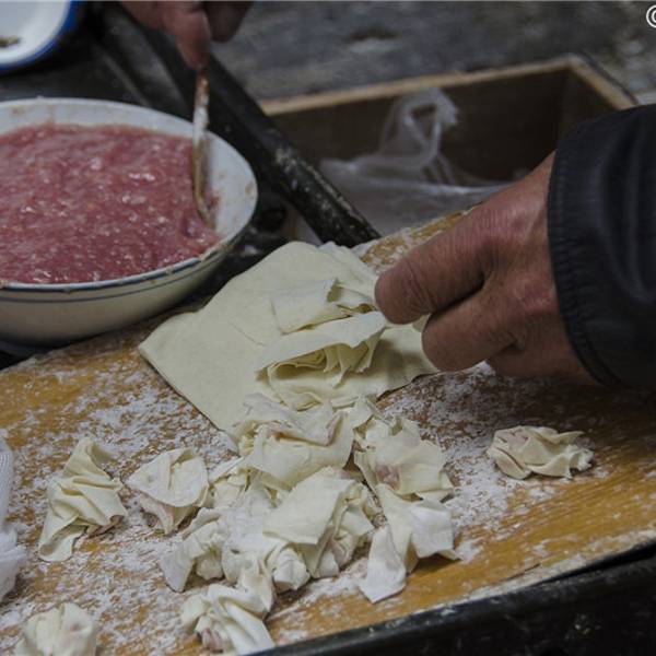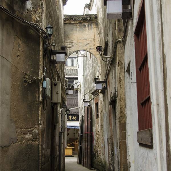 老街上有许多小巷子非常安静,但是走进去会找到一些小吃,老街上有好几家馄饨店,进了一家老店,吃一碗鸡汤馄饨,老板现场包好了馄饨,随手丢进旁边的馄饨挑子里边,煮熟后加入鸡汤,味道鲜美。馄饨挑子是旧时走街串巷卖馄饨用的,非常有意思。