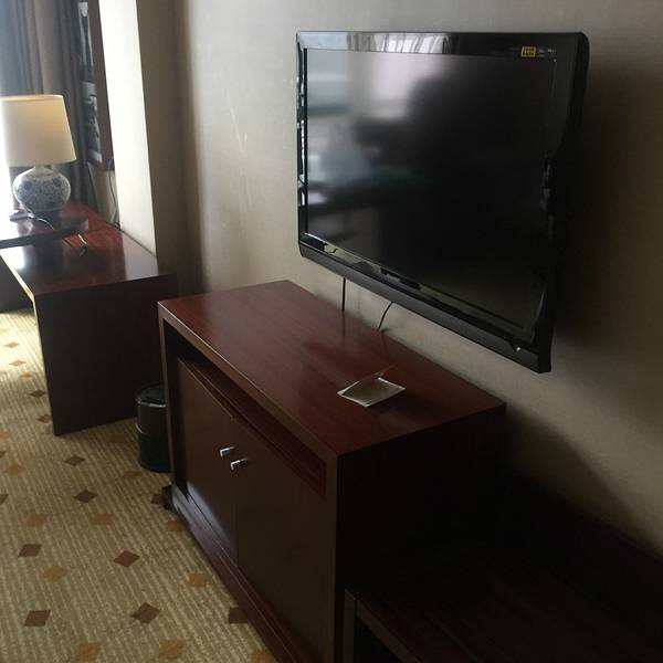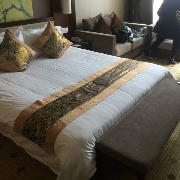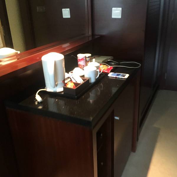 【客房环境】客房很大,家具较多,而且有阳台,总体来说很干净,离店时发现每间房都有吸尘。床有点短,但基本够了。电视机有点问题,频道还要自己调适。卫生间有自动卷帘。WIFI通过身份证后六位连入,但是速度偏慢,大概几百K每秒。