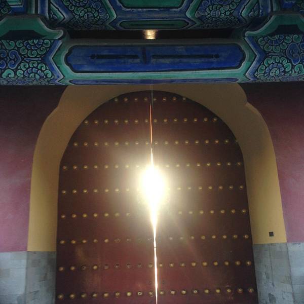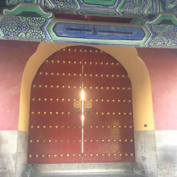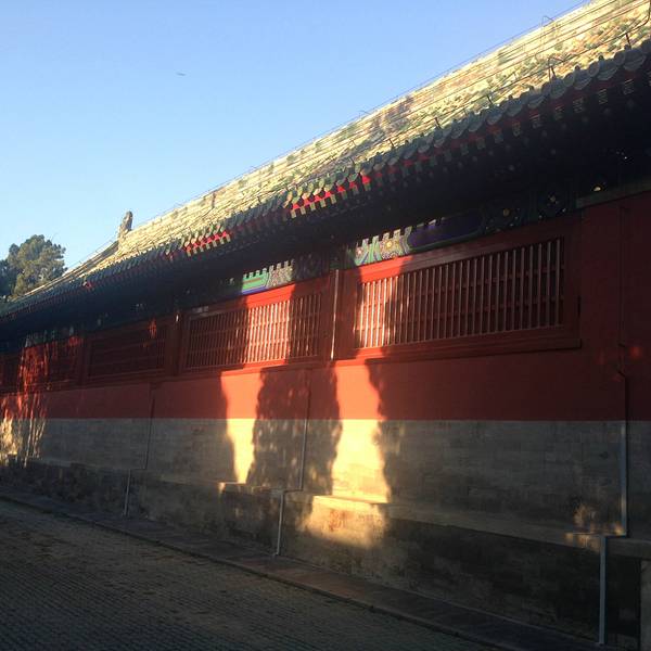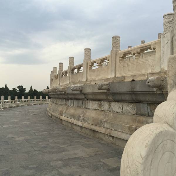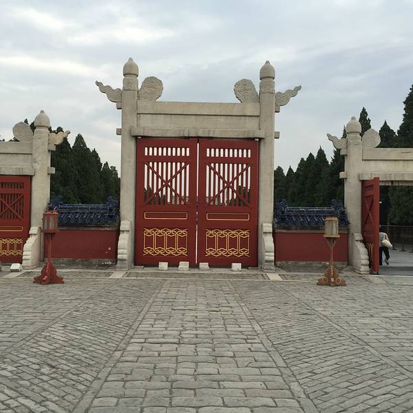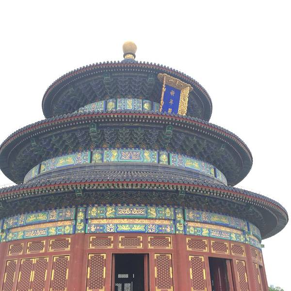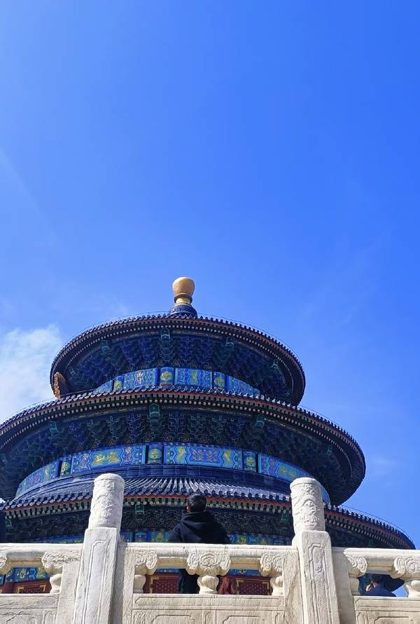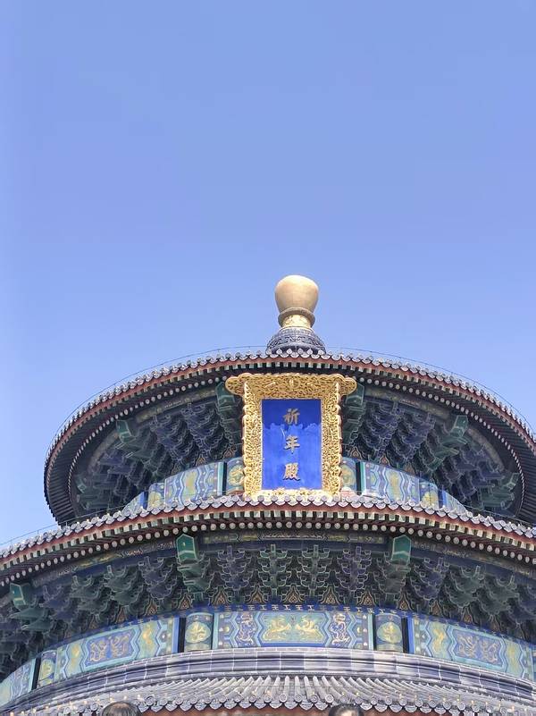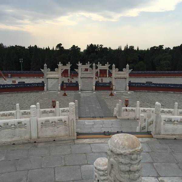 我们是从天坛公园西门进入,在南边的一面平面图上看了公园的整个布置,因为时间紧凑,所以我们从从西侧进入后只打算游玩局部的景点。从西侧步行大约5/6分钟的样子,就能够比较清楚的看到祈年殿。祈年殿其实就是所谓的天坛所在地,这里就是自明成祖之后历届皇帝祭天的主要场所,里面还供奉“皇天大帝”,即代表天子的权威,也充分显示了君权神授的思想。从我们所在远远看去,整个祈年殿的设计为三层圆亭形,顶上的鎏金造型和宁波鼓楼的造型有异曲同工的相似。三层的屋面上边均为蓝色琉璃瓦,整个建筑宏伟大气。在第三层的正南边,悬挂着祈年殿的蓝底金字的金刻花大匾。祈年殿一层为红色格子木门窗,上边刻着各种古花纹,花纹图案为金黄色,耀眼夺目。门上和二三层外围立面刻画着蓝色为底的金色图案。和顶上的琉璃瓦相呼应。祈年殿北面有一座大殿――皇乾殿。皇乾殿和祈年殿供奉大致相同,只不过距离更近一些,据说是考虑到当年一些皇帝年过古稀后,担心他们体力不够,才在这里又展开了相同的供奉。因我们到达的时候恰逢关门,所以只能很可惜的看看夕阳余光的照射之美了。绕过皇乾殿就是圜丘了。圜丘分为内外两圈,四面均有汉白玉雕刻的形似牌坊的石门,叫做棂星门。是古代祭坛专用门式。圜丘内外各设四组,每组有三门,共八组二十四座,称为“云门玉立”。