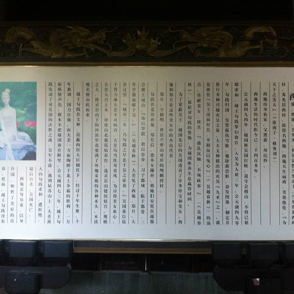据说西施殿几经重建,现在的纪念馆是新建的,房子的屋檐构建,都来自民间采集,虽然没有一丝古代遗留的痕迹,不过整个园子构造精巧,历史人物塑造的栩栩如生。苎萝山不高,沿山碑廊,登高亭台,纪念画展长廊,仿古村落,一圈下来,三四十分钟的样子,最好请导游陪同解说,这样更精彩些,我运气好,蹭着一团,听了不少故事。