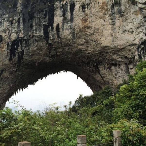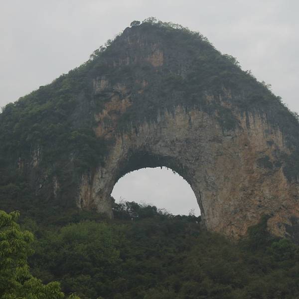 阳朔月亮山风景区位于桂林市阳朔县,是阳朔境内奇景,位于十里画廊景观带的末端。这座山是一座拱形山峰,山顶下方有一个贯穿的大洞,好像一轮皓月,浑然天成。从不同的角度看这座山,此洞形状也随着不断变化,非常有趣。 山高约380多米,游人可顺着一条800多级的登山道直达山顶月洞。月洞面积很大,高宽各有50米,而山壁却只有几米厚。洞的顶部挂满了形状各异的钟乳石,其中两块很像月宫里的吴刚和玉兔。 其实欣赏这座山可以站在远处欣赏,景区对面有一处餐馆云集的休息区,便是可远观山的位置之一。而这座山因其独特的地质环境,也成为攀岩爱好者的聚集之地。