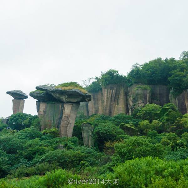 山下是百亩桃园,在桃林之中建有观景的长廊,不过现在初秋的季节没有桃花,也没有桃子,最美的时候应该是每年3月份。沿着台阶可以上山,不过小山并不高,目测也就是几十米而已。刚刚下过雨,从崖壁上流下的雨水形成了一条条瀑布,相当壮观。吼山的标志是三根石柱,这也是古时采石留下来的,如今成了地质奇观。